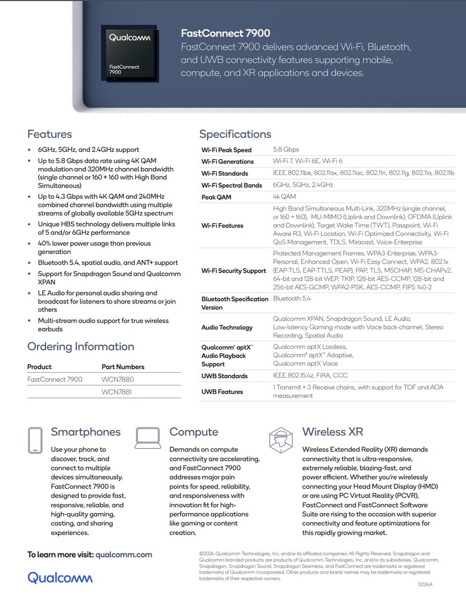 Brzmi to jak rodzaj funkcji jakości usług zwykle spotykanej w routerach, ale według Qualcomm działa ona całkowicie niezależnie od danego routera. Dzięki integracji UWB, obszary zastosowań, takie jak łatwiejsze znajdowanie obiektów, nawigacja w pomieszczeniach lub klucze cyfrowe (np. do samochodów) są również objęte. Jeśli chodzi o Bluetooth, BT 5.4, w tym LE Audio, jest teraz obsługiwany, co wskazuje na dostępność Auracast. Qualcomm twierdzi, że 40% poprawa efektywności energetycznej w porównaniu do pierwszego systemu, FastConnect 7800. Qualcomm twierdzi, że premiera nastąpi w drugiej połowie 2024 roku, prawdopodobnie wraz ze Snapdragonem 8 Gen 4 jesienią.