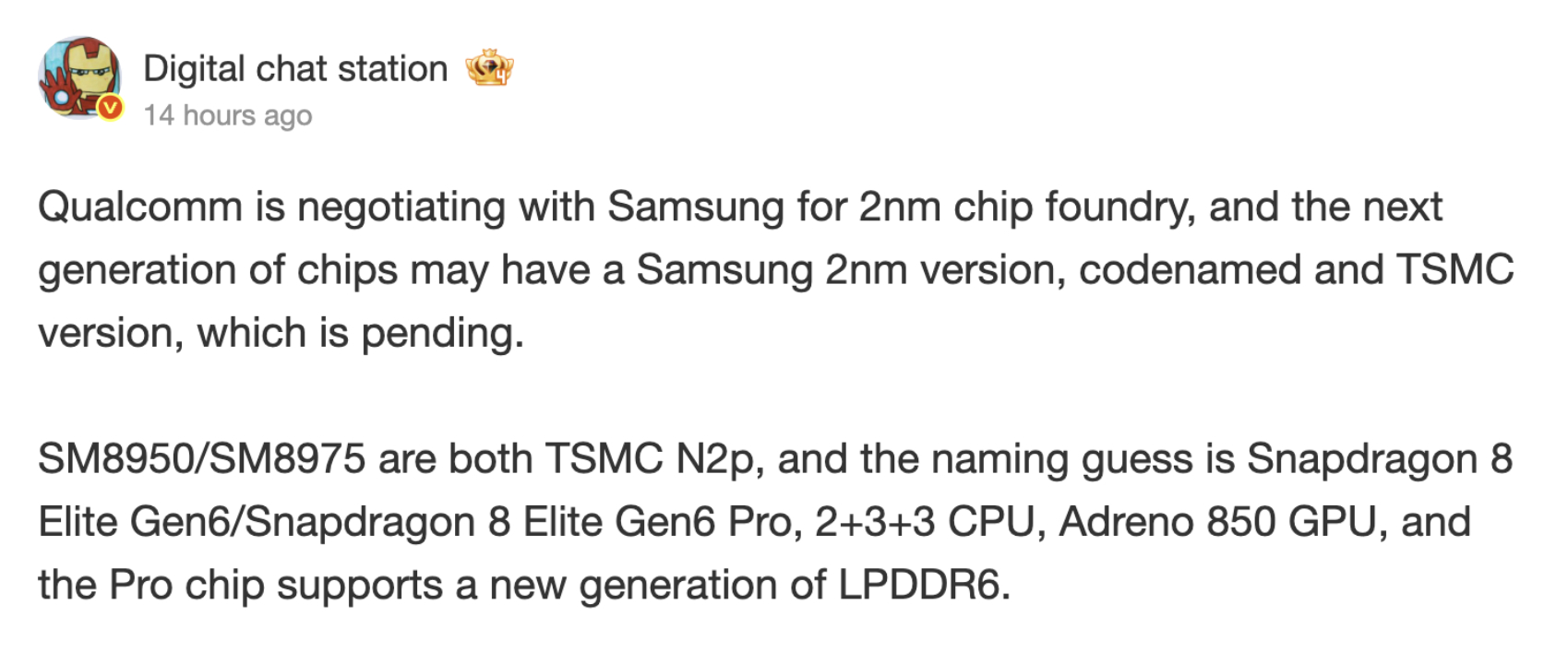 Najwyraźniej warianty SM8950 i SM8975 pozostają na dobrej drodze jako Snapdragon 8 Elite Gen 6 i Snapdragon 8 Elite Gen 6 Pro wspierane przez węzły N2P. Tak więc, konkretne szczegóły na temat tajemniczego wariantu Samsung Foundry prawdopodobnie pojawią się później pod zupełnie inną nazwą kodową. Nawiasem mówiąc, możemy zobaczyć, jak ta współpraca między Qualcomm i Samsung Foundry zaowocuje w tej generacji nowym wariantem Snapdragon 8 Elite Gen 5 dla nadchodzących składanych urządzeń Samsunga.