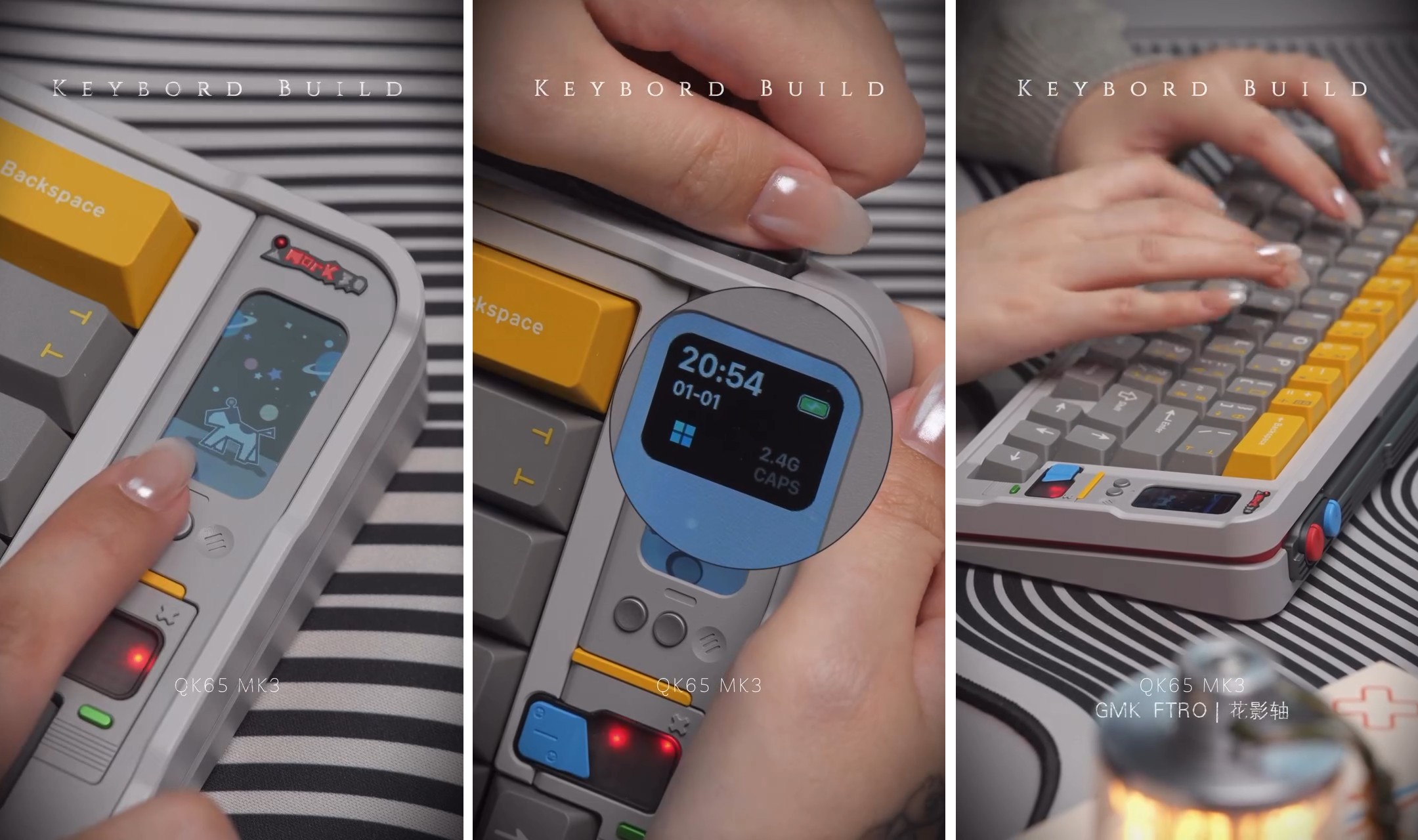 QK65 MK3 charakteryzuje się szarą i matową liliową estetyką w stylu retro, przypominającą klasyczne konsole, takie jak Super NES i Game Boy. Kolorowy wyświetlacz znajduje się na prawej krawędzi klawiatury, a pod nim znajdują się dwa przyciski do sterowania wbudowanymi grami oraz mały głośnik. Ekran może również pokazywać stan systemu i inne informacje, podczas gdy dwa pokrętła w starym stylu na górnej krawędzi pozwalają użytkownikom przełączać się między trybami łączności i systemami operacyjnymi.