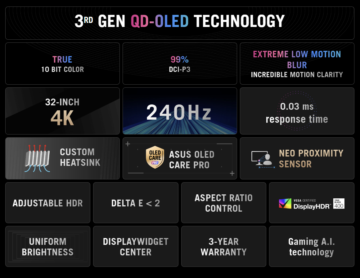Bez ostrzeżenia, Asus najwyraźniej dał Scan zielone światło do otwarcia zamówień przedpremierowych na ROG Strix OLED XG32UQDMS w Wielkiej Brytanii. Podsumowując, nowy monitor opiera się na tej samej technologii paneli QD-OLED 3. generacji, co starsze 32-calowe monitory do gier, takie jak ROG Swift OLED PG32UCDM (obecnie 1243 USD na Amazon). W związku z tym, ROG Strix OLED XG32UQDMS wyświetla obraz w rozdzielczości 4K i 240 Hz z czasem reakcji 0,03 ms GtG i certyfikatem VESA DisplayHDR 400 True Black.