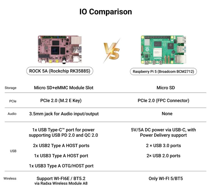 Dla kontekstu, Radxa wyposaża wszystkie jednostki Rock 5A w chipset Rockchip RK3588S, a także pamięć RAM LPDDR4x, pamięć flash eMMC 5.1 i czytnik kart MicroSD. Co więcej, SBC posiada klucz M.2 E dla małych dysków SSD, choć wszystkie dyski są ograniczone do prędkości PCIe 2.1 i SATA 3.0. Ponadto, Rock 5A posiada 40-pinowy nagłówek GPIO, port USB typu C, który obsługuje zasilanie i parę złączy HDMI 2.1, wśród innych wejść/wyjść.