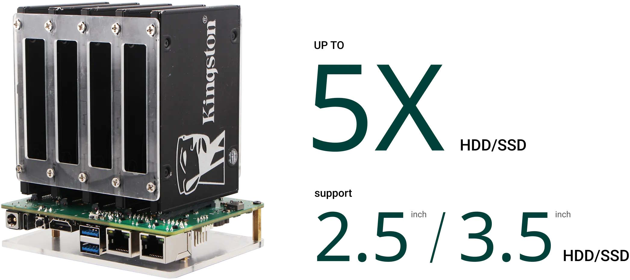 W zestawie znajduje się również gniazdo kart microSD, na których zazwyczaj instalowany jest system operacyjny. Daje to użytkownikom dużą elastyczność, choć są oni również odpowiedzialni za samodzielną instalację i aktualizację systemu operacyjnego. Obsługiwane są macierze RAID 0, 1, 5 i 10. Dostępne są nagłówki GPIO. Dwa porty USB 3.2 Gen 1 umożliwiają również podłączenie zewnętrznych urządzeń pamięci masowej.