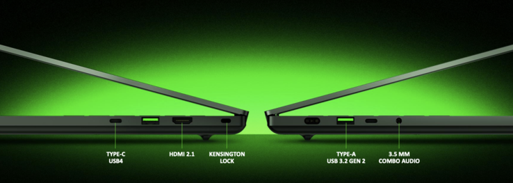 Blade 14 2023 mierzy 310 x 228 x 17,9 mm i waży około 1,83 kg, co czyni go o 11,5% mniejszym i 9% lżejszym niż Blade 15. Niemniej jednak Blade 14 2023 zawiera baterię 68,1 Wh, ulepszony system chłodzenia, o 50% większy gładzik i różne opcje rozszerzeń. Jak pokazuje poniższy obrazek, Razer dołączył gniazda M.2 2230, M.2 2280 i SO-DIMM RAM, jeśli zajdzie potrzeba wymiany karty Wi-Fi, dysku SSD lub pamięci RAM.