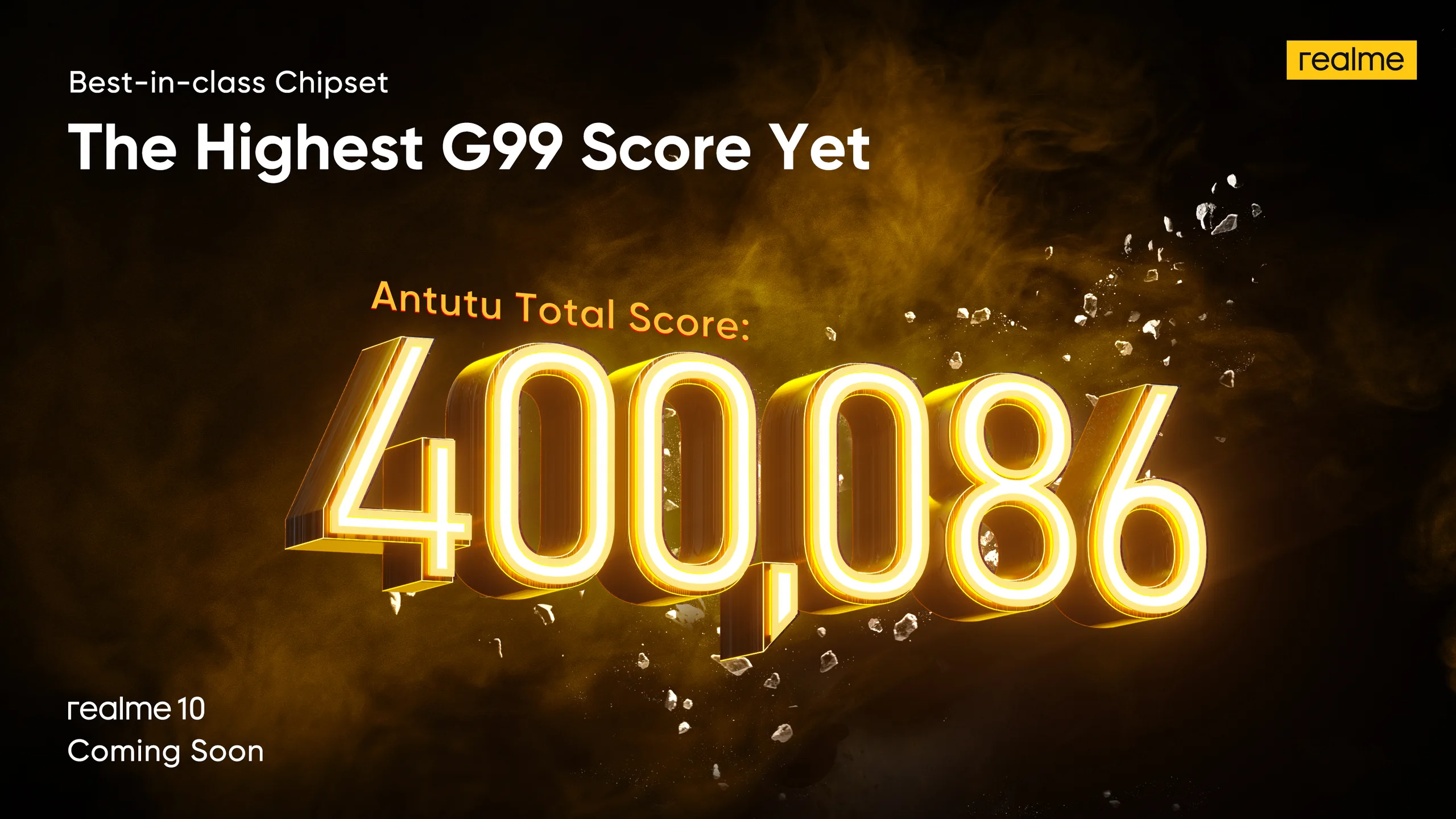 Realme twierdzi również, że było na AnTuTu z urządzeniem przed jego premierą, i że ustalił, że 10 4G był w stanie ustanowić najwyższy wynik dla swojego SoC na tym benchmarku na dzień 28 października 2022 roku. Smartfon entry-level podobno ukończył te testy z łącznym wynikiem 400,098.