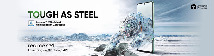 C61 zadebiutuje również jako wczesny użytkownik TÜV Rheinland nowy certyfikat wysokiej niezawodności, który pochodzi z Realme nowego znaku towarowego ArmorOchrona skorupy i wzmocnione szkło wyświetlacza - chociaż nie przeszkadza to w posiadaniu w stylu kropli wody wycięcia w stylu kropli wody.