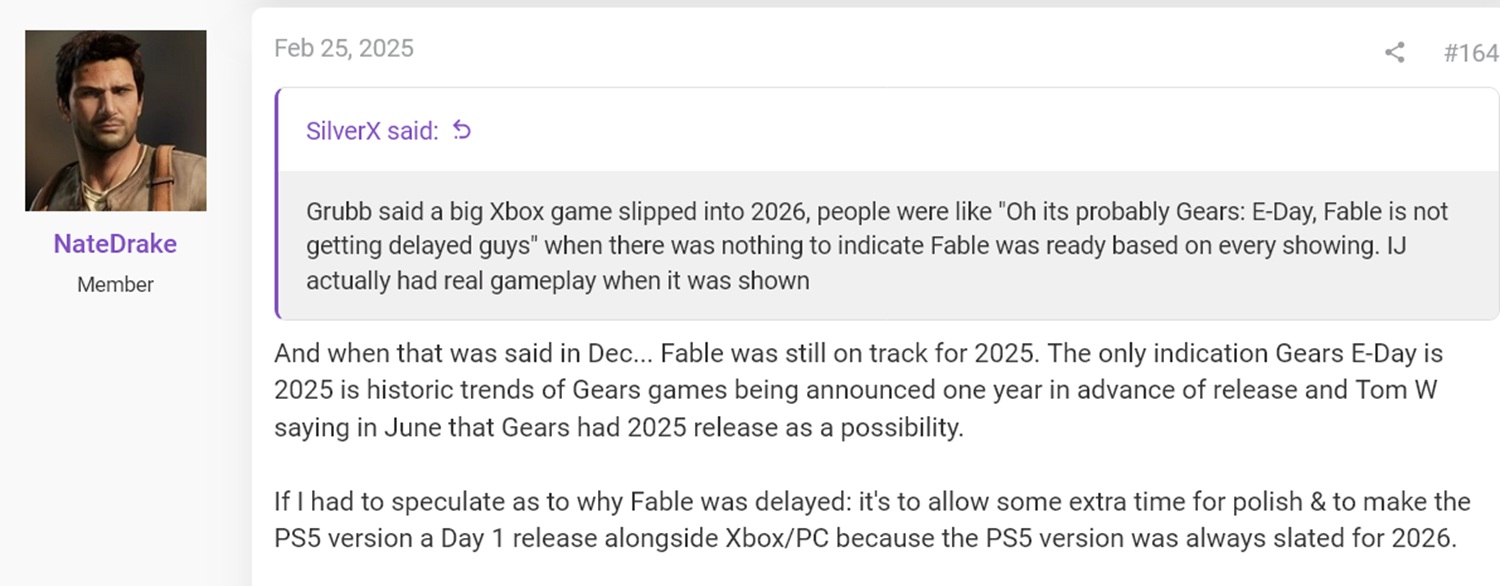 Po raporcie VGC i wiadomościach, że Fable będzie na czele nadchodzącego wydarzenia Xbox, powtórzył swoje poprzednie komentarze. Niezrażony NateTheHate2 powiedział na Reddicie"Jedyną niewiadomą jest to, czy gra pojawi się na PS5 w dniu premiery na Xbox"