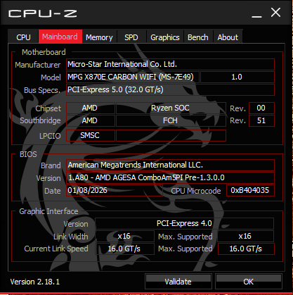 - Płyta główna MSI MAG X870E Carbon Wi-Fi z BIOS-em 1.A80 (AGESA ComboAM5PI Pre-1.3.0.0)