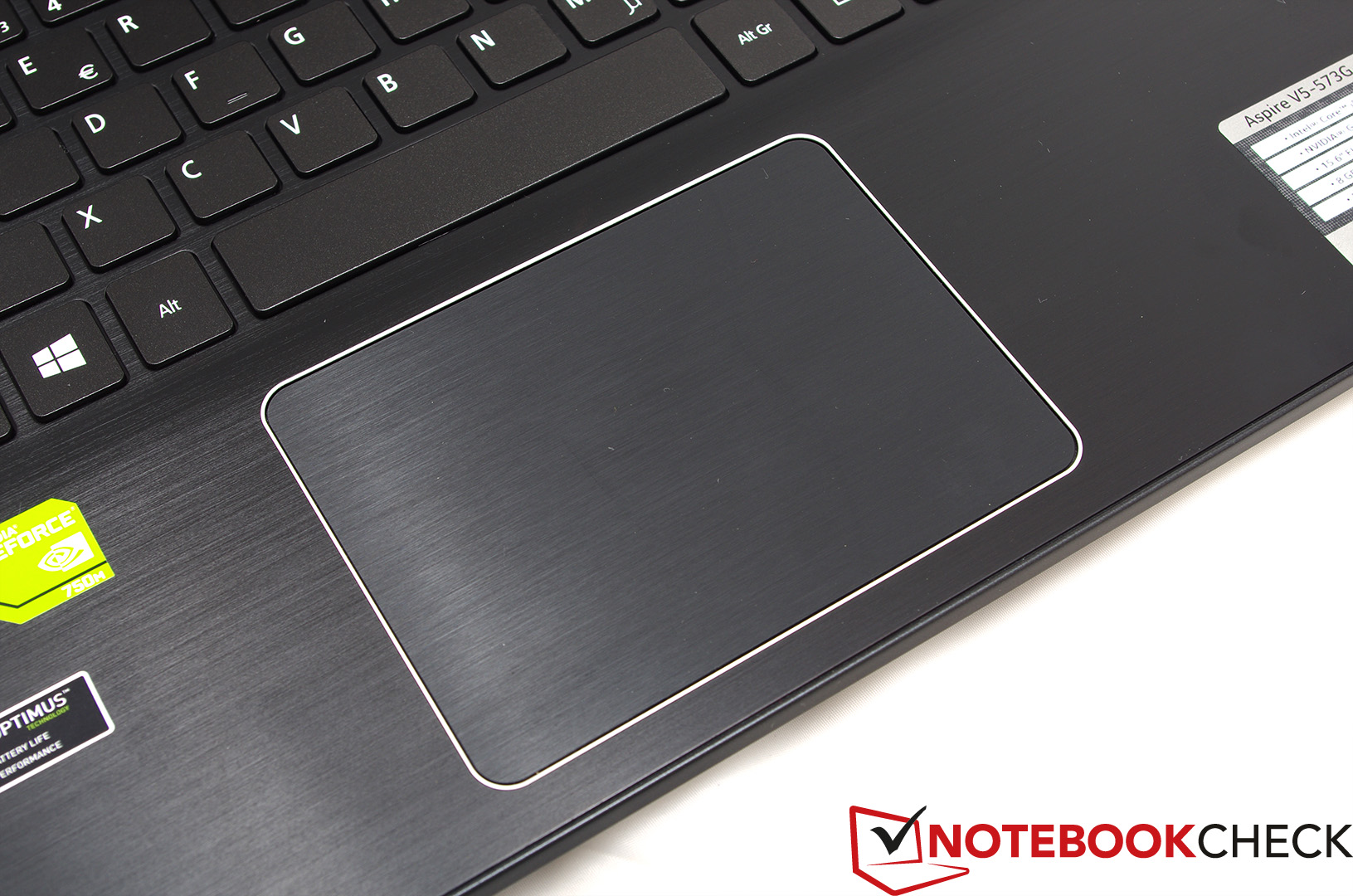 Aspire V5-573 posiada podświetlaną na biało klawiaturę wyspową o bardzo niskich, płaskich klawiszach. Klawisze mają nader krótki skok i są raczej miękkie. W trakcie testów słaba odpowiedź klawiatury skutkowała literówkami. Na pochwałę zasługuje to, że podczas krótkiego skoku klawisze praktycznie nie generują żadnego kliku, więc klawiatura jest cicha.