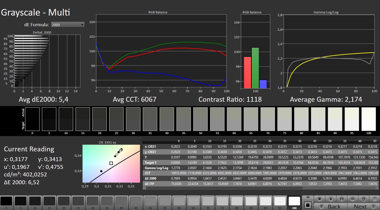 | Greyscale dE 2000 * | 5.4 | 4 26% | 3.9 28% | 1.7 69% | 1.9 65% |