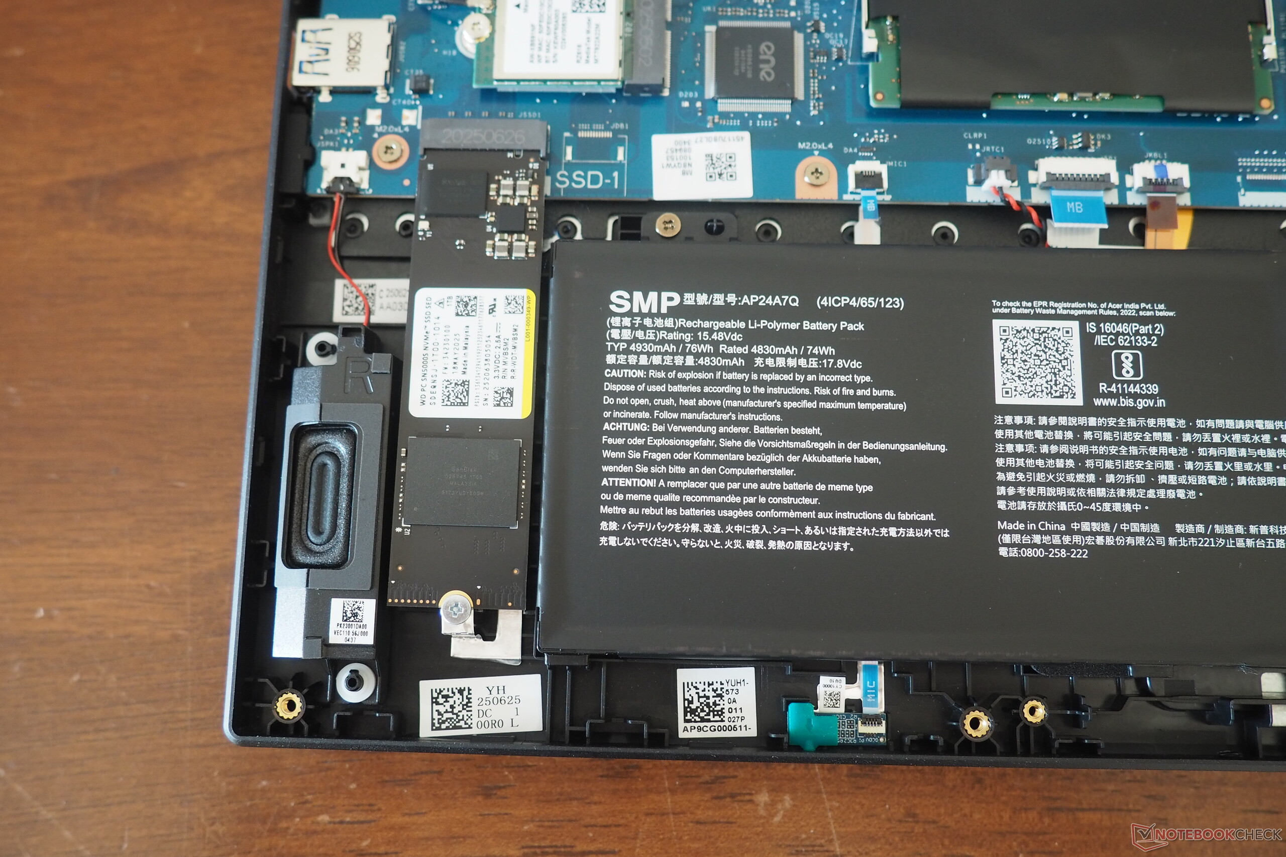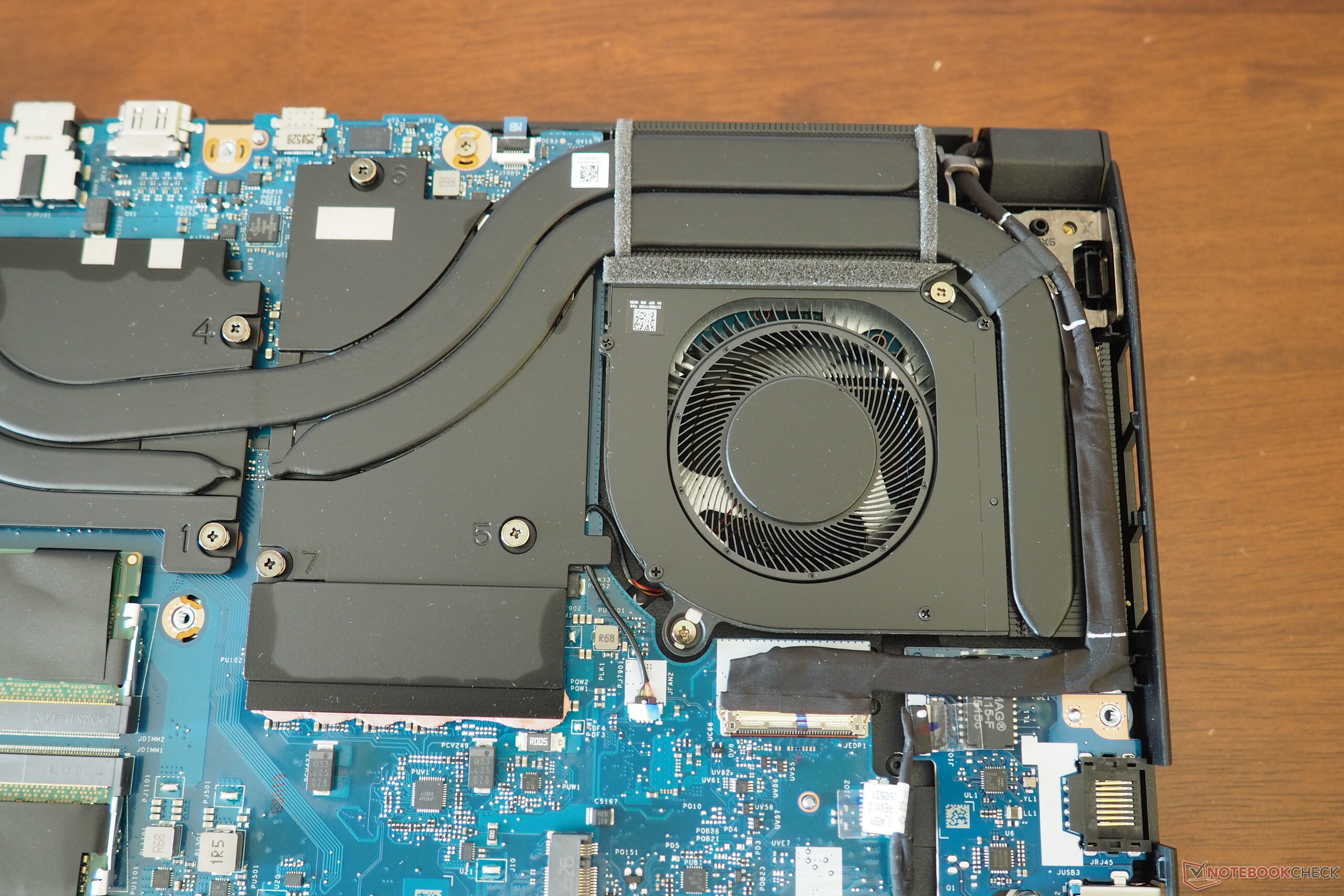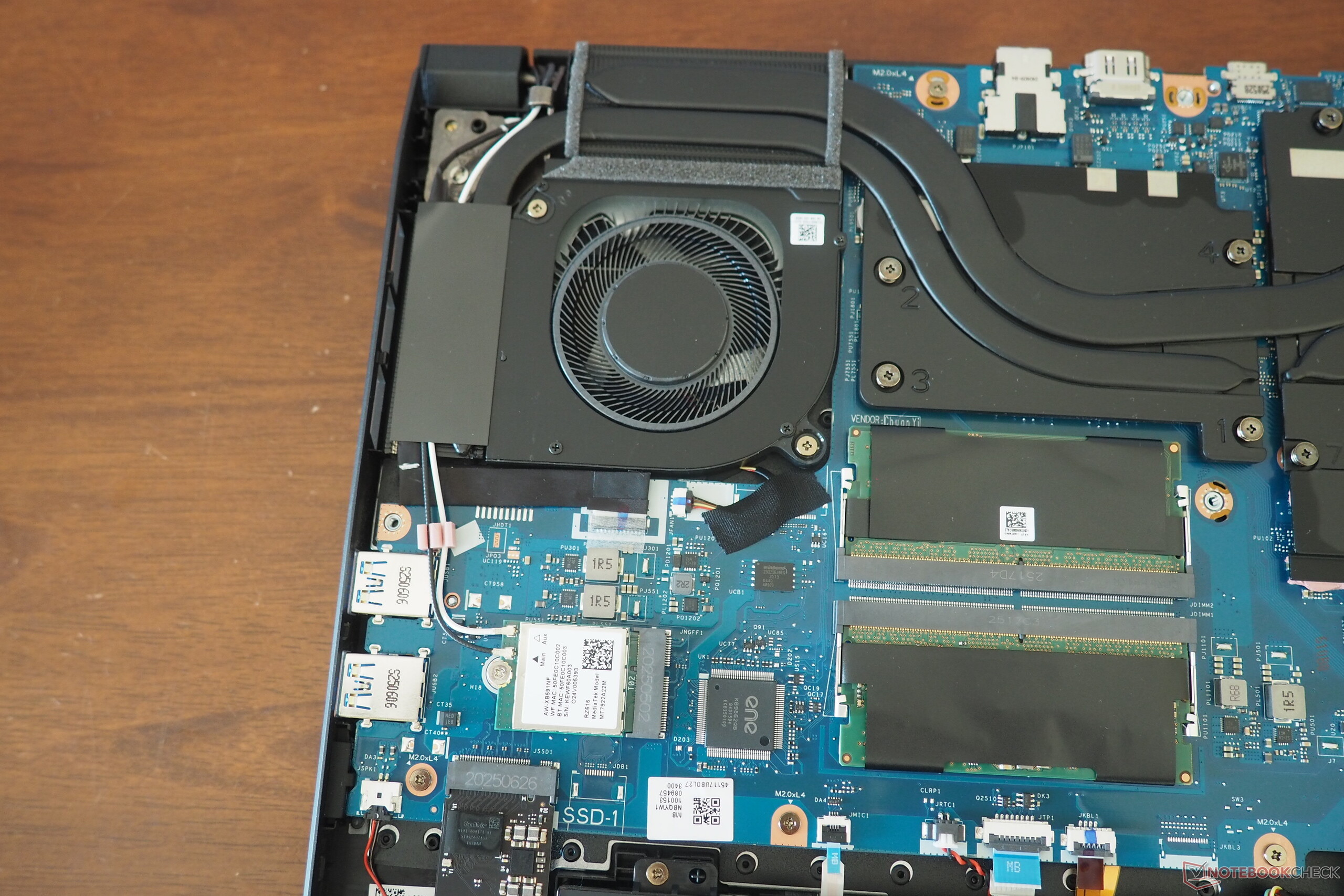 Aby uzyskać dostęp do wnętrza, należy odkręcić łącznie 10 śrub krzyżakowych. Pod maską, oprócz systemu chłodzenia z dwoma wentylatorami, znajduje się również moduł bezprzewodowy, bateria, dwa gniazda SO-DIMM i dwa gniazda M.2.