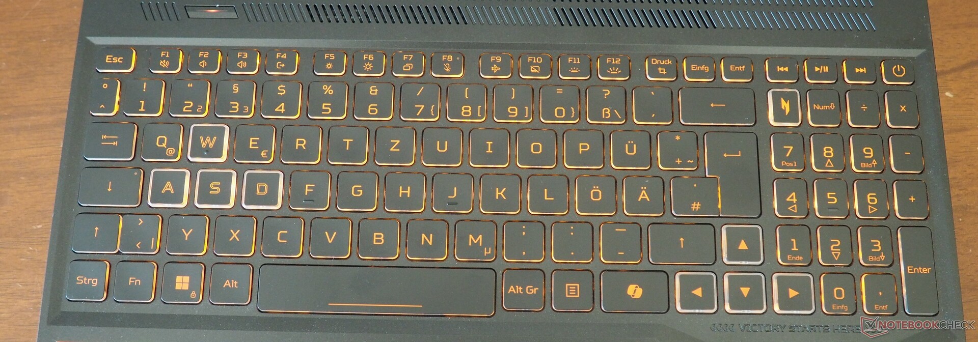 Maksymalny kąt otwarcia wynoszący ok. 145° jest wyższy niż zwykle spotykany w tej klasie. Podświetlenie klawiatury jest pomarańczowe, co pasuje do koloru napisów na klawiszach.