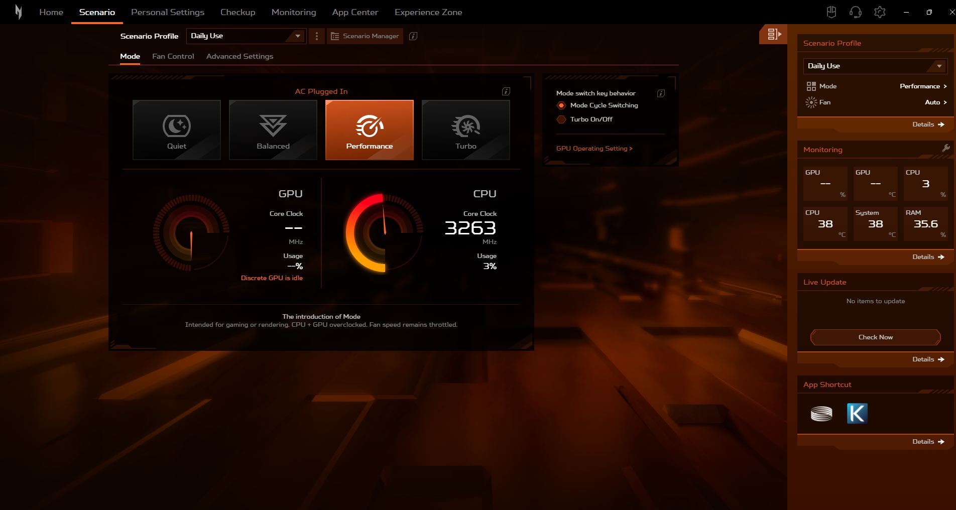 Spośród czterech profili NitroSense (Quiet, Balanced, Performance, Turbo) używamy "Performance", który umożliwia również dostęp do przełącznika MUX.