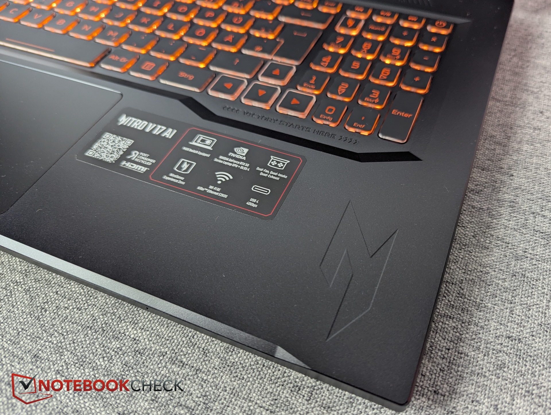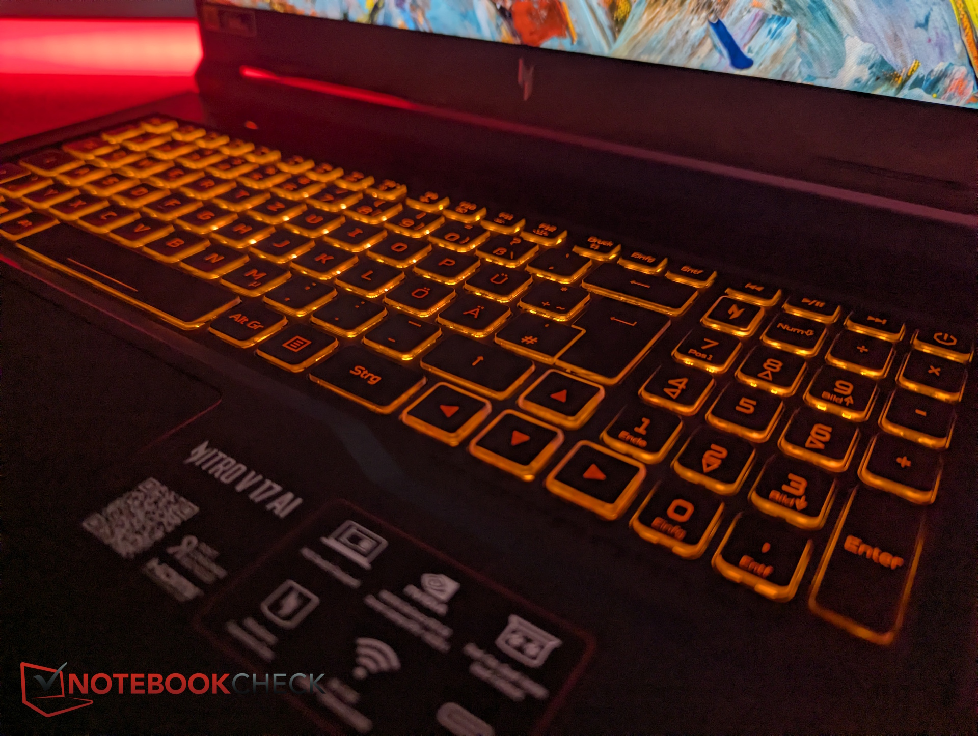 Pomimo 17-calowej obudowy, klawisze klawiatury numerycznej są zauważalnie małe. Etykiety klawiszy są wydrukowane w kolorze pomarańczowym, co skutkuje słabym kontrastem. Nie ma dedykowanego klawisza NitroSense, a podświetlenie klawiatury RGB jest ograniczone do jednej strefy.