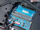 Do podzespołów wewnętrznych można się dostać, zdejmując dużą pokrywę serwisową na spodzie. Akumulator nie jest przykręcony i można go wyjąć po odłączeniu kabla. Dwa z czterech gniazd SO-DIMM znajdują się pod pokrywą serwisową a pozostałe dwa - pod klawiaturą. Ciekawe jest to, że omawiany laptop posiada dwa złącza pod dyski SSD M.2 (jedno z nich było zajęte). Jest też oczywiście zatoka dysku 2,5" (w której znajdował się dysk HDD). By dostać się do karty Wi-Fi i wentylatorów, trzeba zdjąć pozostałą część spodu obudowy. W tym celu należy odkręcić 10 śrubek.