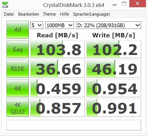 Drugi dysk z omawianego laptopa to Samsung HN-M101MBB, zwykły HDD o pojemności 1 TB i prędkości 5400 obr/min. W teście CrystalDiskMark odczyt i zapis sekwencyjny przekroczyły w jego przypadku 100 MB/s.