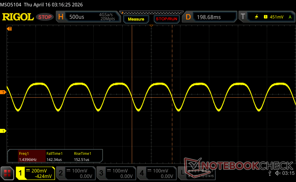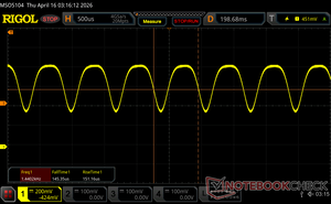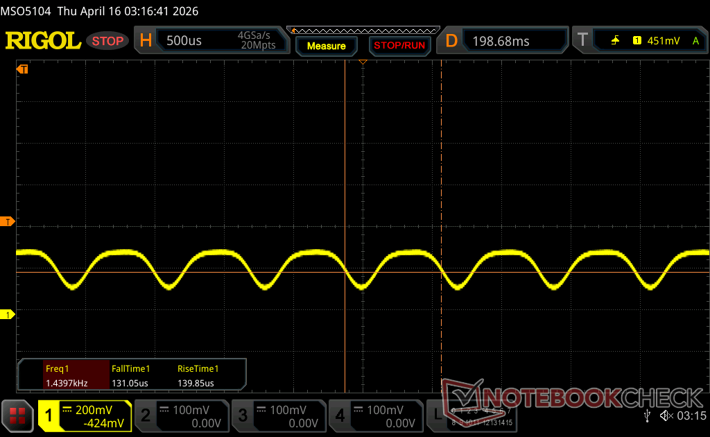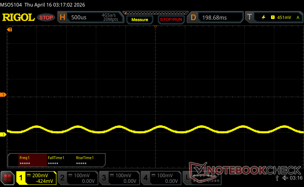 Podświetlenie wyświetlacza miga z częstotliwością 1440 Hz (najgorszy przypadek, np. przy użyciu PWM) Wykryto migotanie przy ustawieniu jasności 100 % i poniżej. Powyżej tego ustawienia jasności nie powinno być żadnego migotania ani PWM. Częstotliwość 1440 Hz jest dość wysoka, więc większość użytkowników wrażliwych na PWM nie powinna zauważyć żadnego migotania. Dla porównania: 52 % wszystkich testowanych urządzeń nie używa PWM do przyciemniania wyświetlacza. Jeśli wykryto PWM, zmierzono średnio 7901 (minimum: 5 - maksimum: 343500) Hz. | |||