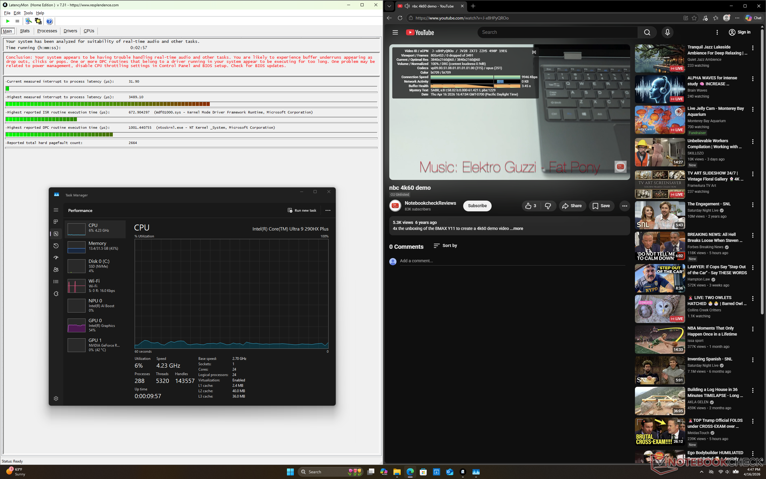 Po uruchomieniu stresu Prime95 w trybie Overdrive (tj. w trybie maksymalnego wentylatora), procesor zwiększyłby częstotliwość taktowania do 4,3 GHz, 182 W i 105 C (!), a następnie nieznacznie spadł do zakresu od 3,9 do 4,1 GHz, aby utrzymać nieco niższą temperaturę rdzenia od 95 C do 100 C. Dla porównania, przeprowadzenie tego samego testu na Alienware 16 z 2025 r. spowodowałoby niższą średnią częstotliwość taktowania procesora i temperaturę odpowiednio 3,6 GHz i 92 C. Oczywiste jest, że Core Ultra 9 290HX Plus przesuwa istniejące rozwiązanie chłodzące Alienware 16 do absolutnych granic możliwości.