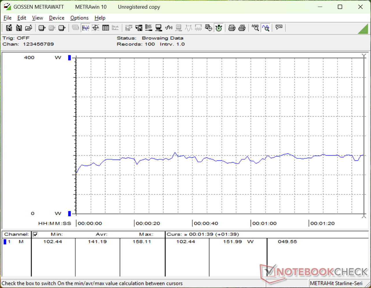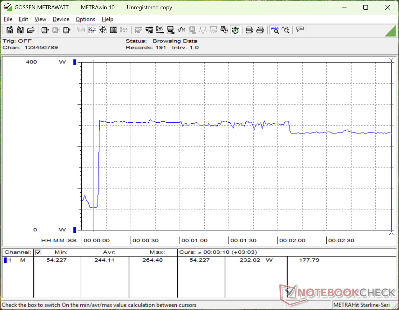 Core Ultra 9 290HX Plus jest od 15 do 25 procent szybszy niż poprzedni Core Ultra 9 275HX, jak wspomniano powyżej. Nieprzypadkowo nasz Alienware 16 z 2026 roku jest od 15 do 25 procent bardziej wymagający niż Alienware 16 z 2025 roku, gdy procesor jest obciążony. Uruchomienie Prime95 na najnowszym modelu Alienware zużywa około 255 W, gdy Turbo Boost jest najbardziej efektywny lub 230 W, gdy Turbo Boost ustabilizował się, w porównaniu do zaledwie 200 W w zeszłorocznym modelu. Nawet gdy nie gramy, nowszy model jest ogólnie bardziej wymagający o co najmniej kilka watów więcej.