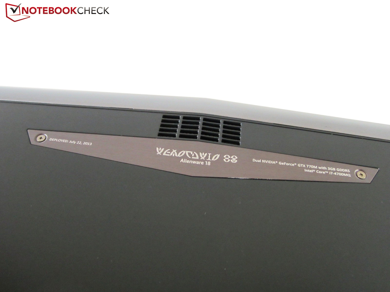 Omawiany laptop wygląda podobnie do mniejszych modeli Alienware 14 i 17. Tak jak one, Alienware 18 posiada metalowe wieko (wg producenta wykonane z aluminium). Ramka ekranu i otoczka klawiatury mają miękkie, gumowane wykończenie. Wadą ciemnej kolorystyki tej części laptopa jest to, że bardzo widać tam kurz.