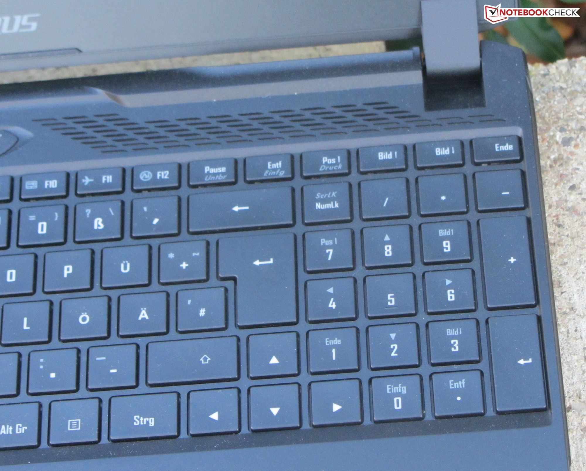 Laptop do gier jest wyposażony w klawiaturę typu chiclet, która zawiera blok numeryczny. Gładkie klawisze oferują umiarkowany zasięg i wyraźny punkt aktywacji. Klawiatura nie wygina się podczas pisania. Każdy klawisz jest indywidualnie podświetlany i posiada dwa poziomy jasności. Ogólnie rzecz biorąc, Gigabyte dostarczył klawiaturę, która nadaje się do codziennego użytku.