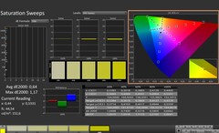 Wyświetlacz ma przyzwoite odwzorowanie kolorów zaraz po wyjęciu z pudełka. Jego różnica kolorów wynosząca 3,36 znajduje się nieco poza idealnym zakresem (DeltaE <3). Kalibracja ekranu zmniejszyła różnicę kolorów do 0,74 i sprawiła, że odcienie szarości wyglądają płynniej. Wyświetlacz w pełni pokrywa przestrzeń barw sRGB (100%) i prawie udaje mu się odtworzyć całą gamę DCI-P3 (95%). Charakteryzuje się również pokryciem przestrzeni AdobeRGB na poziomie 85%.