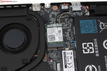 Po odkręceniu wszystkich śrubek na spodzie można otworzyć dolny panel za pomocą płaskiego szpachli lub skrobaka do uszczelniania. Po zdjęciu panelu uzyskamy dostęp do dwóch gniazd pamięci RAM (oba zajęte), dysku SSD PCIe 4.0, drugiego gniazda M.2 2280 (PCIe 4.0), baterii BIOS-u, modułu Wi-Fi, dwóch wentylatorów, głośników i akumulatora.