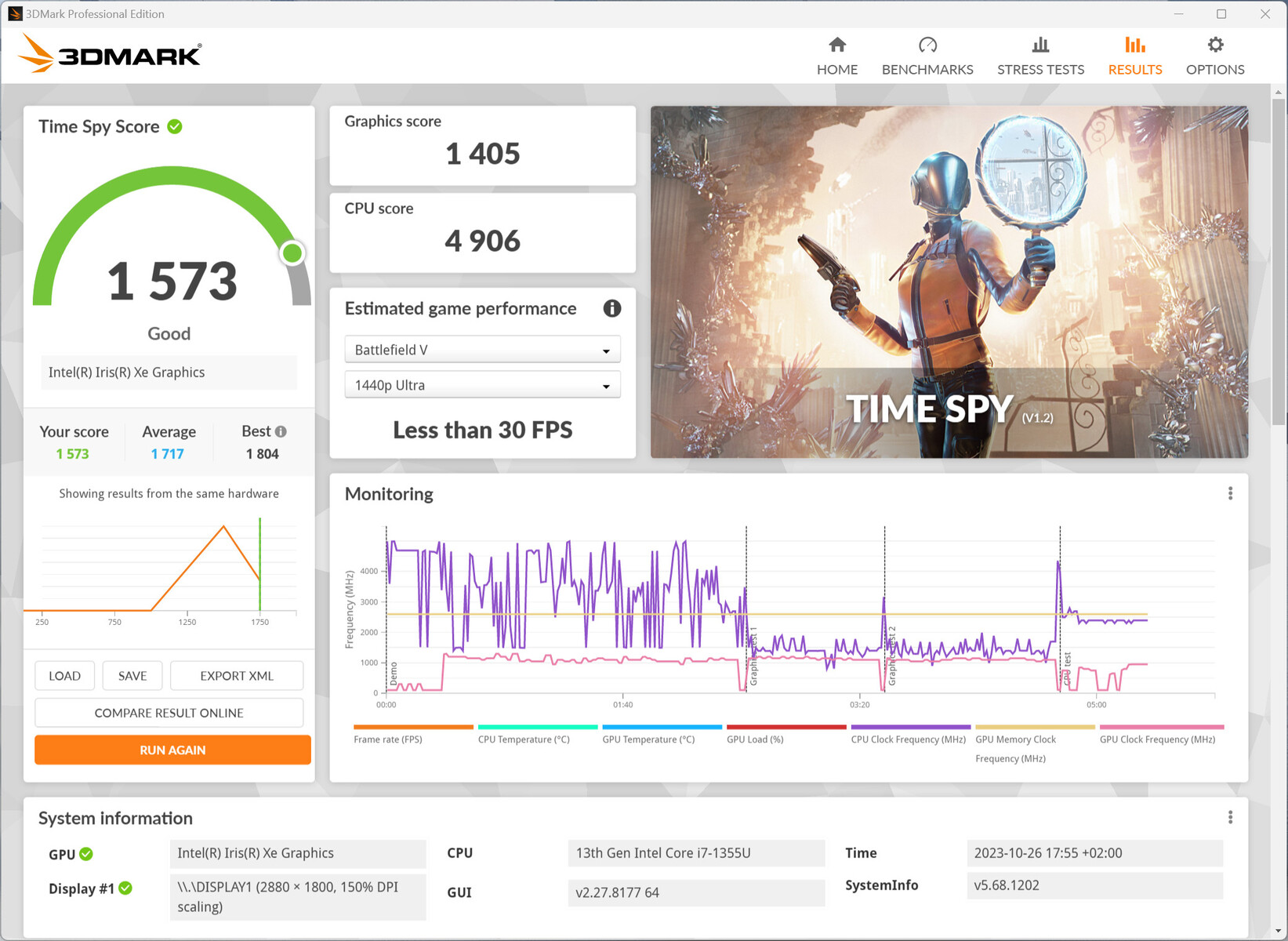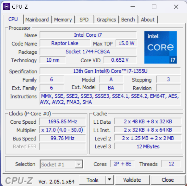 Fakt, że procesor niezawodnie radzi sobie z poborem mocy na poziomie 15 W można zaobserwować podczas pracy na standardowych ustawieniach i w trybie bateryjnym. Efektywna prędkość zegara i temperatura Intel Core i7-1355U pozostają stałe przez cały czas.