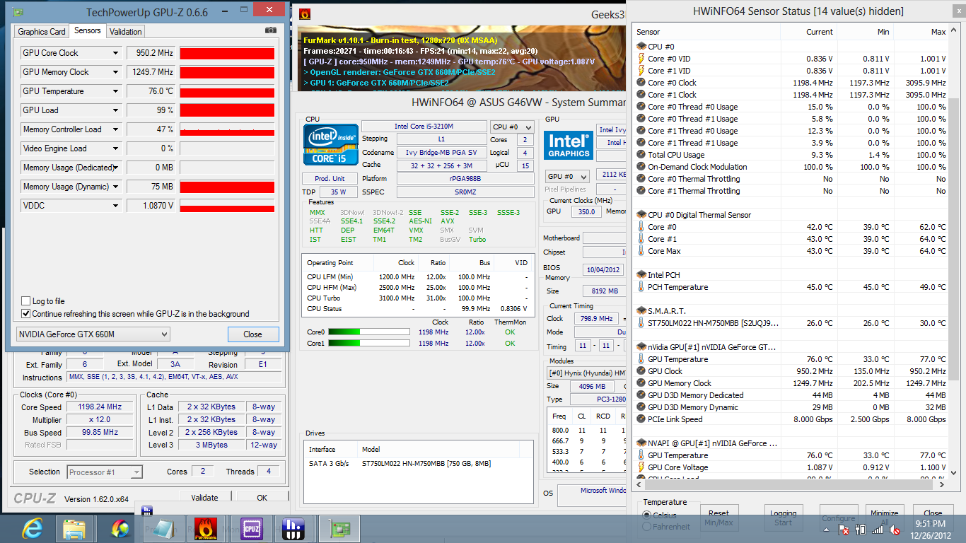 Testowany egzemplarz był wyposażony w procesor Intel Core i5-3210M, popularną jednostkę Ivy Bridge będącą na wyposażeniu wielu laptopów średniej klasy. To dwurdzeniowy procesor o TDP na poziomie 35 W, którego bazowa częstotliwość taktowania wynosi 2,5 GHz i który bez problemu osiąga w Asusie G46VW 2,9 GHz przy obciążeniu obu rdzeni (co jest możliwe dzięki funkcji Turbo Boost). Kiedy ustawimy oszczędny plan zasilania, taktowanie jest obniżone do 1,2 GHz. Więcej informacji o tym procesorze i wyniki jego testów z różnych laptopów można znaleźć na poświęconej mu stronie.