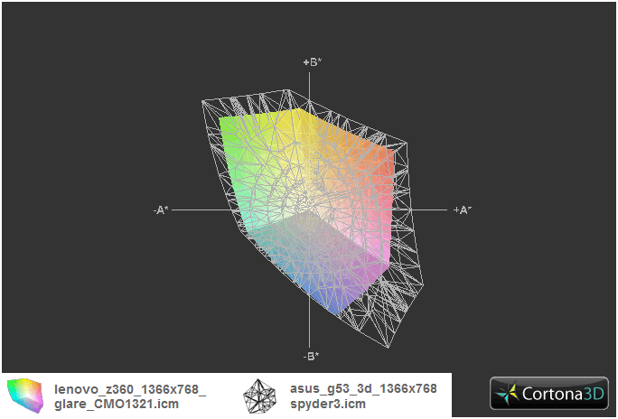W porównaniu do standardowych wyświetlaczy Asus G53JW może się także pochwalić ponadprzeciętnymi możliwościami w odwzorowywaniu kolorów. Brakuje mu pod tym względem naprawdę niewiele do pełnej przestrzeni sRGB. Zainstalowana w nim matryca nie może się jednak równać z ekranami montowanymi np. w MacBookach Pro 13”-17” czy też niemalże wzorcowym wyświetlaczem RGB LED znajdującym się na wyposażeniu Della SXPS 16.