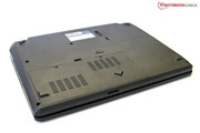 Na spodzie omawianego laptopa znajduje się pokrywa serwisowa, która pozwala na dostęp do akumulatora, zatoki dysku i dwóch wolnych gniazd pamięci operacyjnej. Chcąc dostać się do pozostałych dwóch gniazd RAM, trzeba zdemontować podnadgarstnik i klawiaturę. Układ chłodzenia z dwoma wentylatorami znajduje się pod płytą główną i nie ma łatwego dostępu do niego.