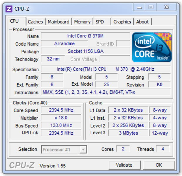 Core i3-370M został wykonany w procesie technologicznym 32 nm, jest taktowany zegarem 2,4 GHz i posiada 3 MB pamięci podręcznej trzeciego poziomu. Porównując wyniki testów przeprowadzonych przy pomocy 3DMarka06, Cinebencha 10 i SuperPi, testowany procesor jest bardzo zbliżony pod względem wydajności do droższego i5-430M, a według wPrime - nawet minimalnie szybszy. Jednostkę i3-370M wyekwipowano w najpotrzebniejsze spośród najnowszych technologii Intela; żałować można jedynie, że poskąpiono mu technologii Turbo Boost.