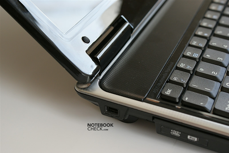 Lakiery, ach te lakiery. Jako że prezentowany model przynależy do linii M plasującej się dość wysoko w asusowej hierarchii, machnięto w nim czarne, błyszczące pokrycie wieka (z ornamentem Infusion). Tyle tylko, że ozdobiona tymże klapa bardzo się palcuje (a zafajdany w ten sposób sprzęt wygląda koszmarnie), a tego efektu nie uświadczymy (albo występuje w znikomym stopniu) w tradycyjnie wykończonych konstrukcjach, bez efektownego pokrycia.