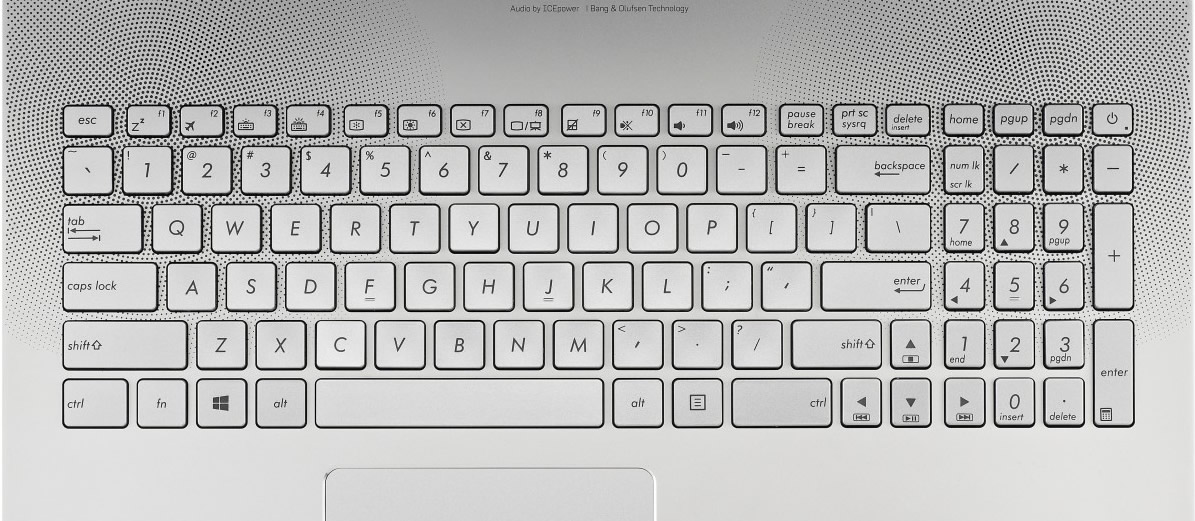 Powszechny w laptopach marki Asus zmniejszony oddzielny blok numeryczny to słabe rozwiązanie. Osoby o dużych dłoniach podczas wpisywania cyfr muszą się borykać z gęsto ustawionymi klawiszami, więc wprowadzanie danych nie jest tak szybkie i wygodne, jak powinno być. Poza tym układ klawiatury N551JW jest pozbawiony niespodzianek. Klawisze są miękkie, jako że ich opór nie jest za duży, a amortyzowanie jest dość wyraźne. Podświetlenie ma trzy poziomy intensywności. Kiedy jest wyłączone, szaroczarne oznaczenia jasnych klawiszy są czytelne. Kiedy zaś jest włączone, oznaczenia te świecą na jasnoniebiesko i są czytelne tylko w zaciemnionym miejscu. Podczas pisania na klawiaturze klawisze działają cicho.