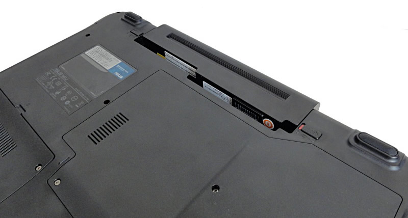 Akumulator osadzony w gnieździe trzyma się pewnie - pod wpływem nacisku bateria nie chybocze się na boki. Specjalne wcięcie w obudowie akumulatora ułatwia wyjęcie baterii z wnęki. Obecność klapy serwisowej na spodzie platformy roboczej umożliwia prosty dostęp do wewnętrznych podzespołów notebooka.