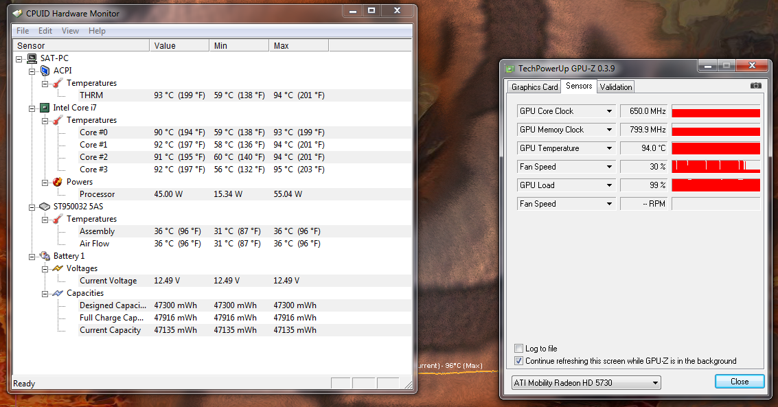 Obciążenie komponentów notebooka dość znacznie wzmaga hałas wydobywający się z układu chłodzenia. Przy maksymalnej zajętości czasu procesora i karty graficznej prędkość wirnika nie spada poniżej 4500 obr/min, co automatycznie przekłada się na obniżenie kultury pracy urządzenia (41,9 dB). Na najwyższym biegu wiatraczek wykazuje tendencję do zmiany szybkości obrotów, które w momentach szczytowych generują prawie 44 dB (przy 5000 obr/min), by kilkadziesiąt sekund później zredukować poziom hałasu do wartości 42,5 dB (przy 4600 obr/min).