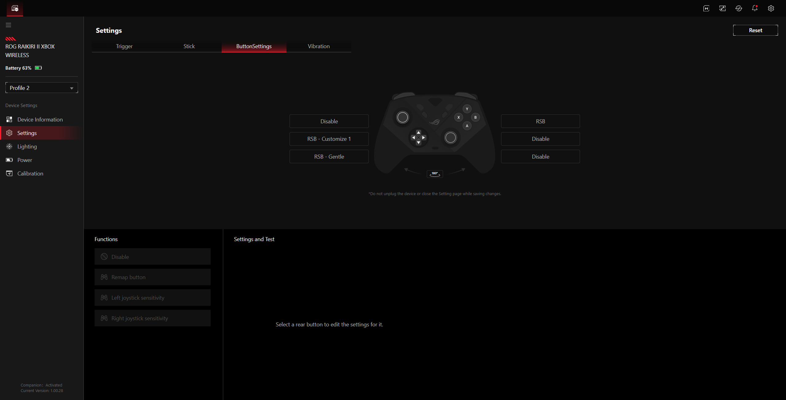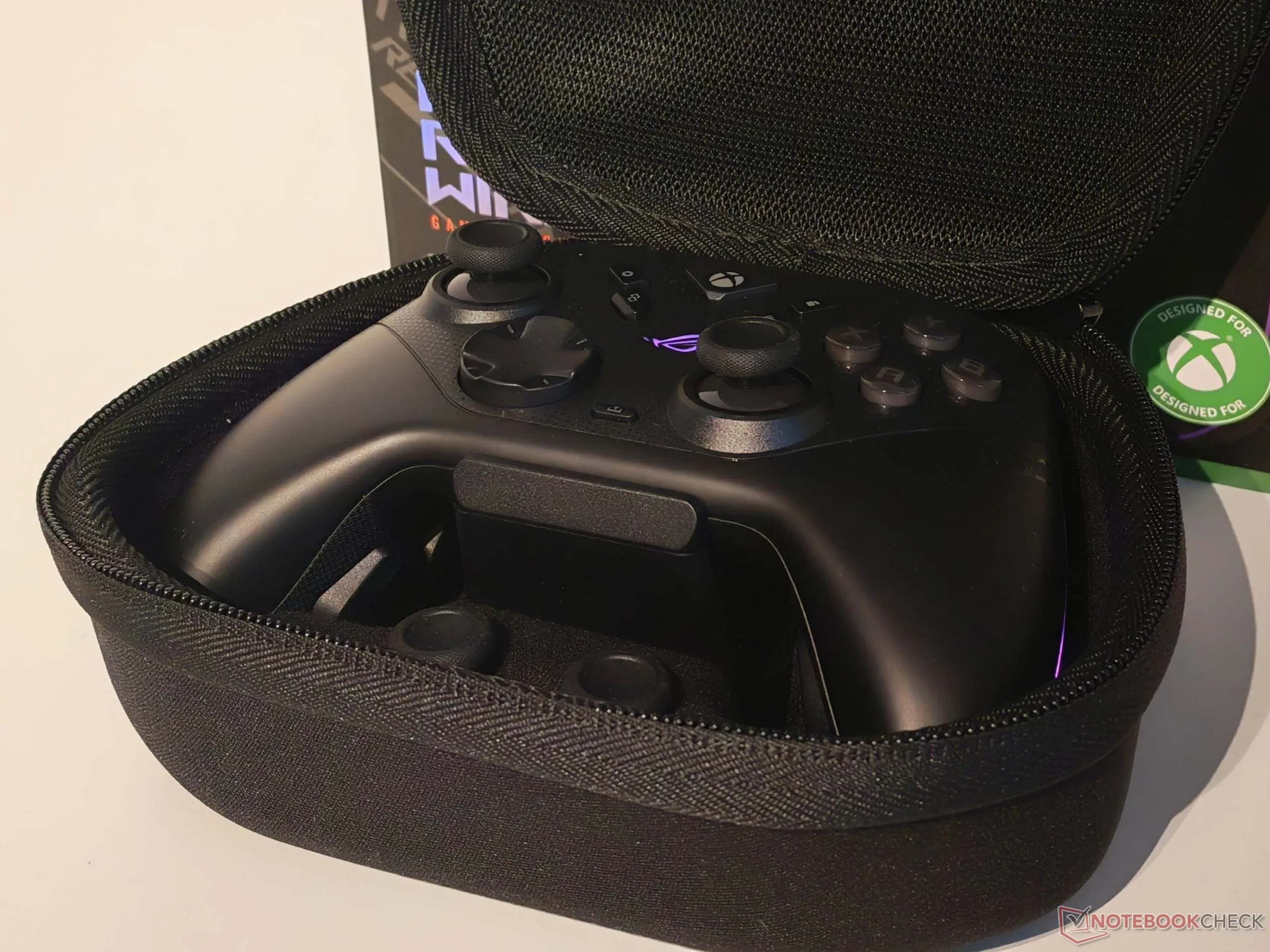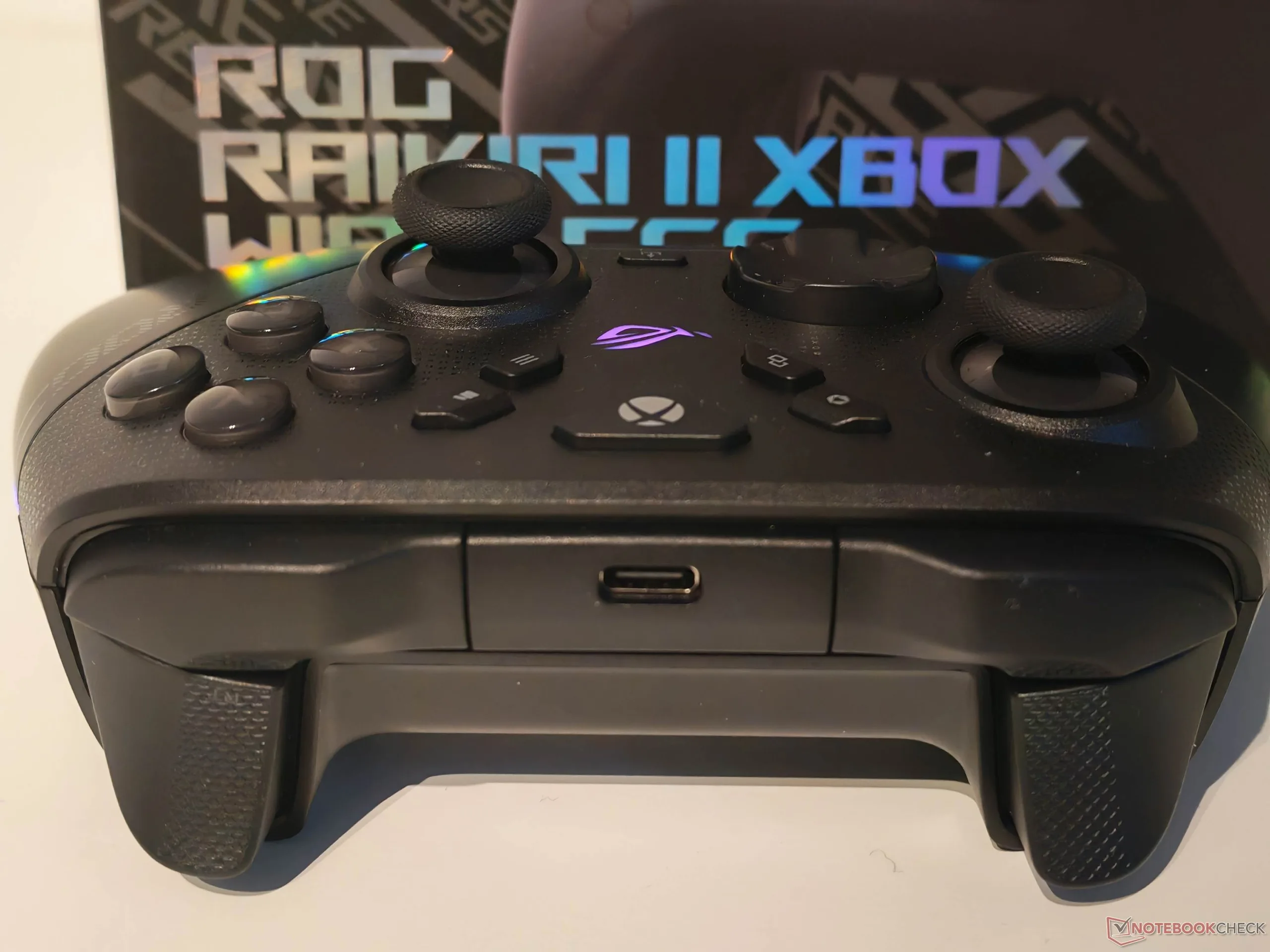Intensywność wibracji można regulować oddzielnie dla dwóch silników wibracyjnych, a oświetlenie RGB można skonfigurować w trzech strefach (lewa, prawa i logo ROG). Przełączanie pomiędzy pięcioma profilami odbywa się za pomocą kombinacji klawiszy (Pair + Y). Ponadto, krzywe joysticka można zmieniać po naciśnięciu przycisku i niezależnie od aktywnego profilu - tak długo, jak przycisk jest przytrzymywany - podobnie jak przycisk snajperski na myszy. W strzelankach może to być przydatne do przełączania między bronią zamontowaną na pojeździe, normalną rozgrywką i snajperką.