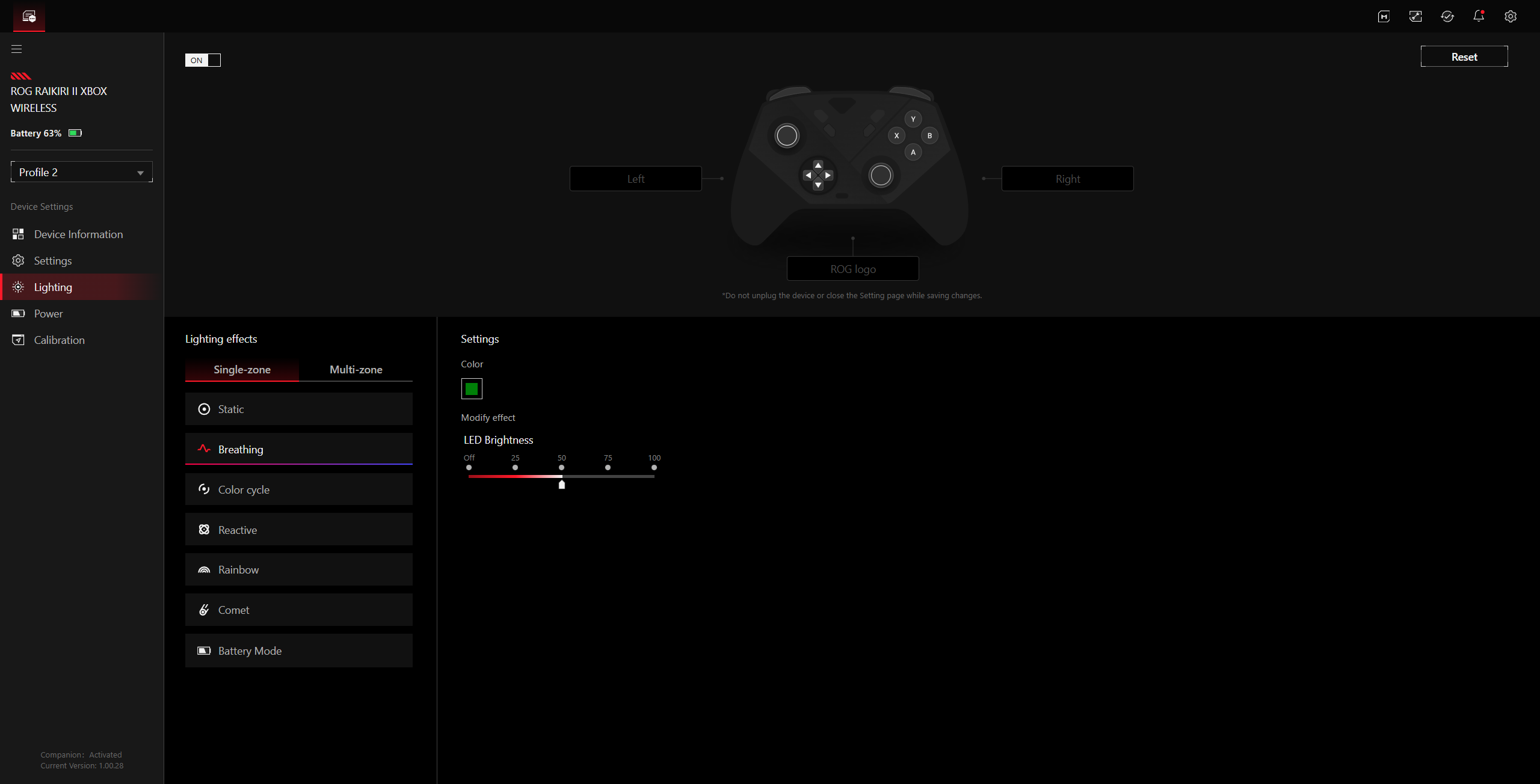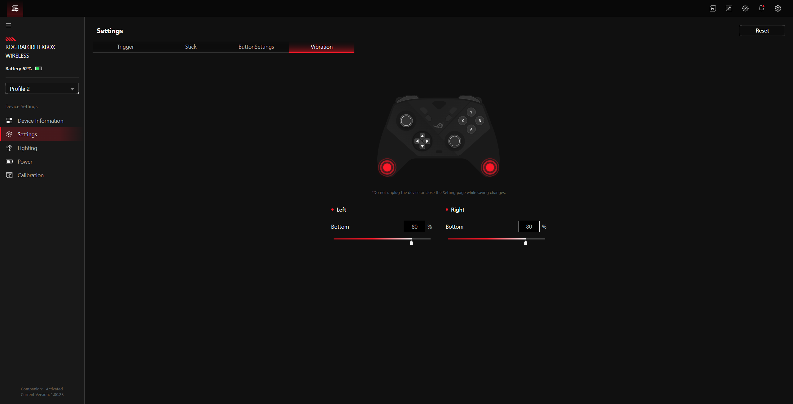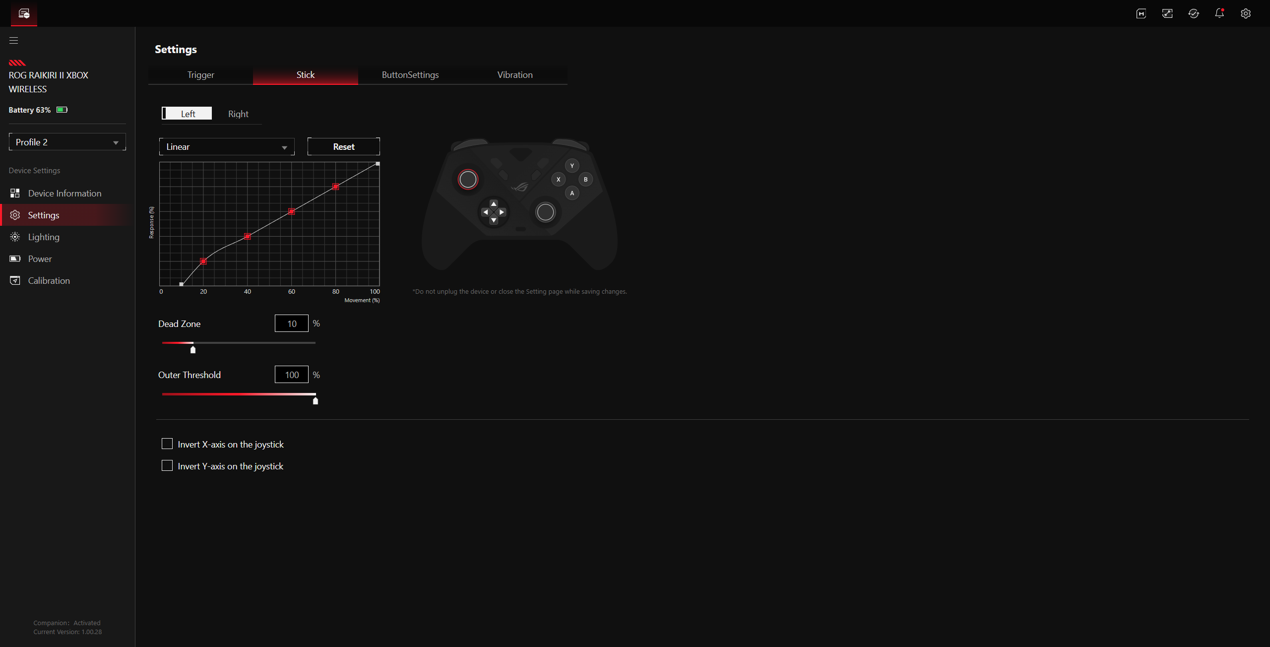 Intensywność wibracji można regulować oddzielnie dla dwóch silników wibracyjnych, a oświetlenie RGB można skonfigurować w trzech strefach (lewa, prawa i logo ROG). Przełączanie pomiędzy pięcioma profilami odbywa się za pomocą kombinacji klawiszy (Pair + Y). Ponadto, krzywe joysticka można zmieniać po naciśnięciu przycisku i niezależnie od aktywnego profilu - tak długo, jak przycisk jest przytrzymywany - podobnie jak przycisk snajperski na myszy. W strzelankach może to być przydatne do przełączania między bronią zamontowaną na pojeździe, normalną rozgrywką i snajperką.