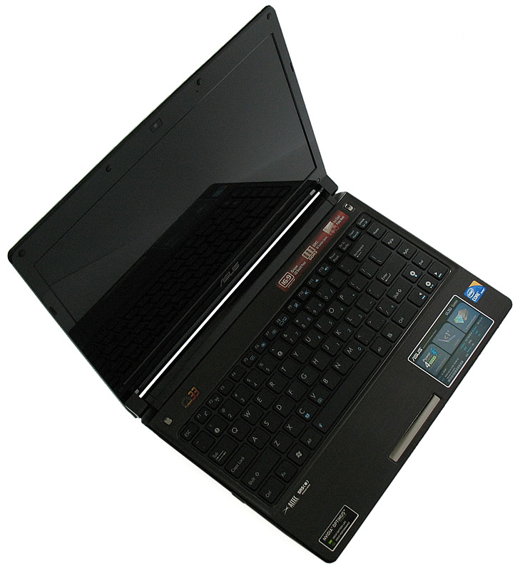 Pozostała część Asusa została wykonana z trzech rodzajów czarnego tworzywa. Typowy surowy plastik na spodzie i bokach współtworzy wizerunek laptopa z błyszczącymi elementami ramki matrycy, tacki pod klawiaturą i części baterii. Na szczęście, w odróżnieniu od poprzednich czarnych UL30, tym razem inna jest faktura pulpitu. Matowy materiał ułatwia utrzymanie czystości, a gustowne paski przywodzą na myśl aluminium użyte do wykonania klapy. Drugą pozytywną zmianą w estetyce jest przygaszenie diod znajdujących się na przedniej krawędzi jednostki zasadniczej.