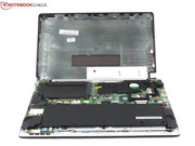 Dostęp do podzespołów jest możliwy od spodu laptopa. Należy odkręcić dziewięć śrubek i zdjąć całą spodnią osłonę. Po jej zdjęciu na widoku są dysk formatu 2,5", karta Wi-Fi i wentylator. Pamięć RAM jest wlutowana w płytę główną. Akumulator jest dostępny, ale został przymocowany śrubkami.