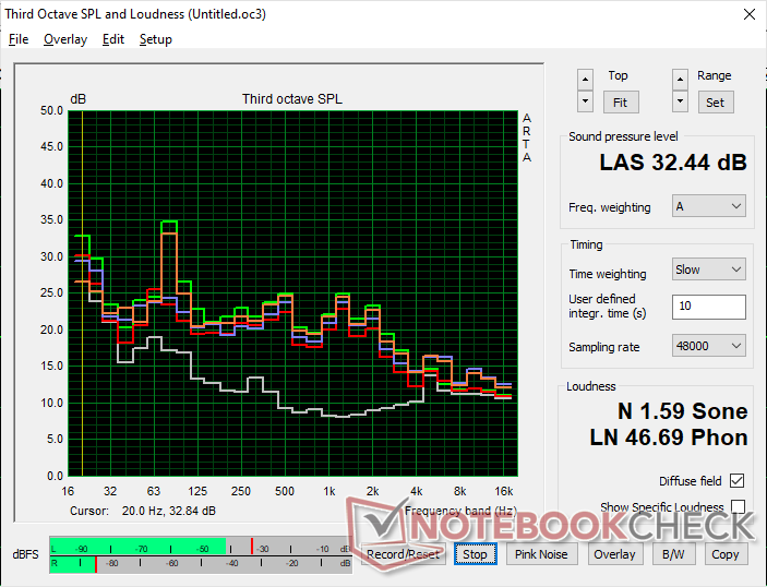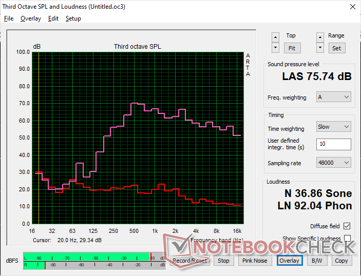 Niestety, głośniki osiągają szczyt na poziomie około 75 dB(A), co jest dobre dla sypialni, ale poza tym po cichej stronie dla salonów lub sal konferencyjnych, gdzie hałas otoczenia jest powszechny. Na przykład, nasza jednostka testowa nie miałaby problemu z odbieraniem naszych poleceń głosowych dla Alexy, ale głośnikom brakuje mocy podczas odtwarzania. Głośniki w HP OmniBook 5 14osiągają na przykład prawie 93 dB(A).
