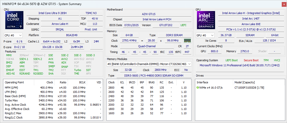 Nasza jednostka testowa została wyposażona w procesor Core Ultra 9 285H, 64 GB pamięci RAM i dysk SSD o pojemności 1 TB w cenie około 1230 USD. Wyższe opcje zwiększają pamięć RAM i dysk SSD odpowiednio do 128 GB i 2 TB, ale niestety nie ma opcji barebones.