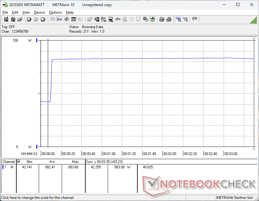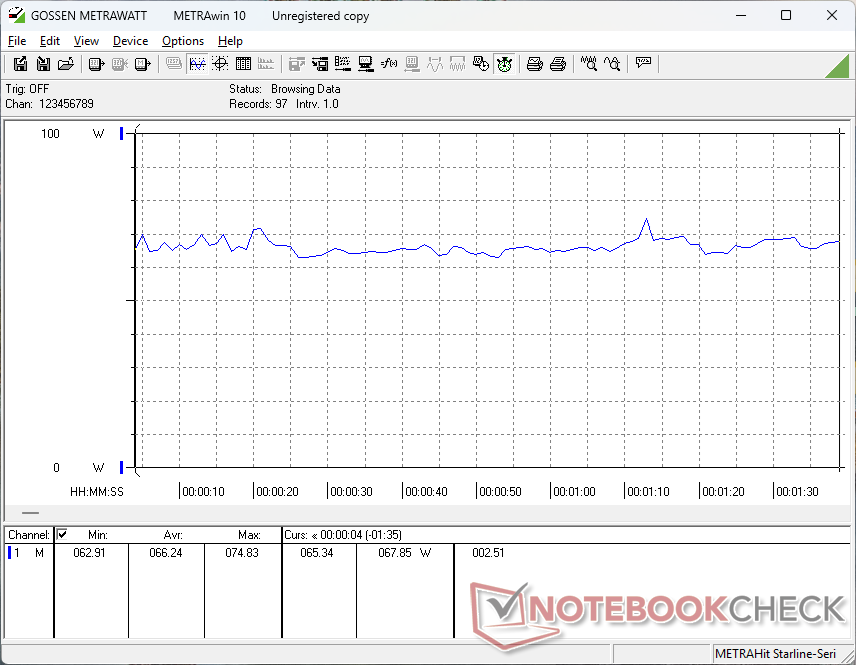 Zużycie jest niezwykle wysokie podczas bezczynności na pulpicie, nawet po sprawdzeniu aktywności w tle lub ukrytych programów. Wysoki wskaźnik występuje nawet w trybie uśpienia, co sugeruje potencjalny błąd stanu zasilania procesora. W przeciwnym razie jest tam, gdzie spodziewamy się, że będzie podczas uruchamiania bardziej wymagających obciążeń. System jest mniej wymagający niż zasilany przez AMD GMK NucBox K12 oferując jednocześnie nieco wyższą wydajność, co przekłada się na lepszą wydajność w przeliczeniu na wat.