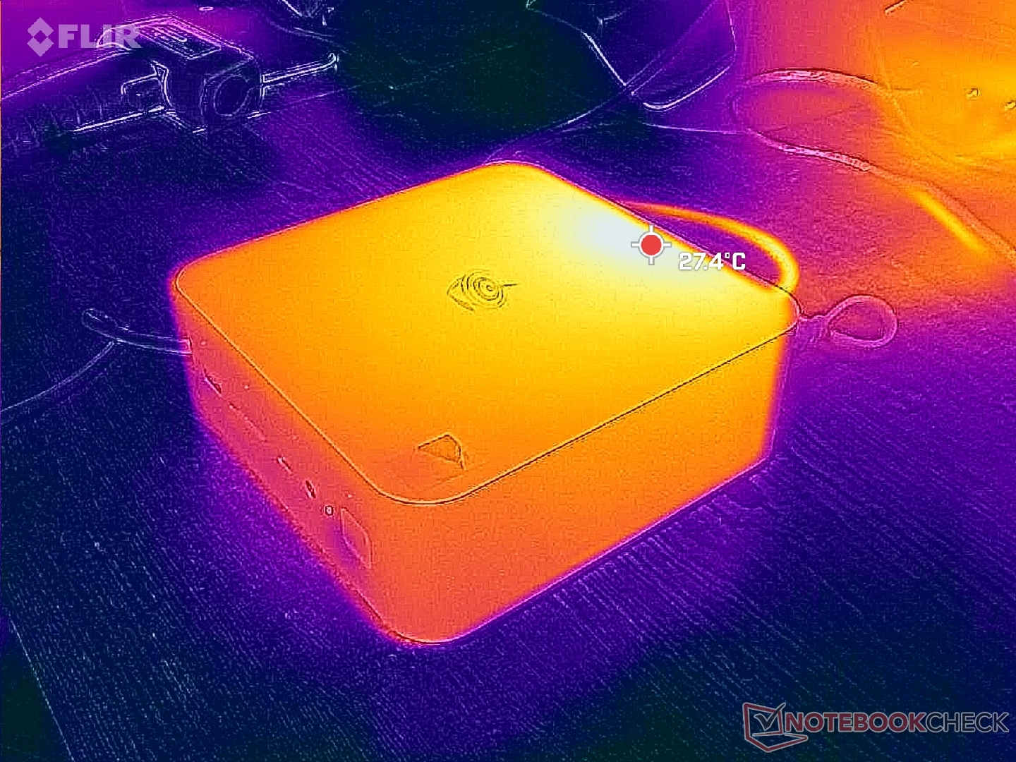 Hałas wentylatorów osiąga poziom 30 dB(A) podczas pracy z wymagającymi obciążeniami, w tym grami, dzięki czemu jest cichszy niż w przypadku wielu innych minikomputerów z procesorami z serii H. Proszę jednak pamiętać, że przy ustawieniu systemu w trybie wydajności za pośrednictwem BIOS-u, poziom ten może z łatwością zbliżyć się do 40 dB(A).
