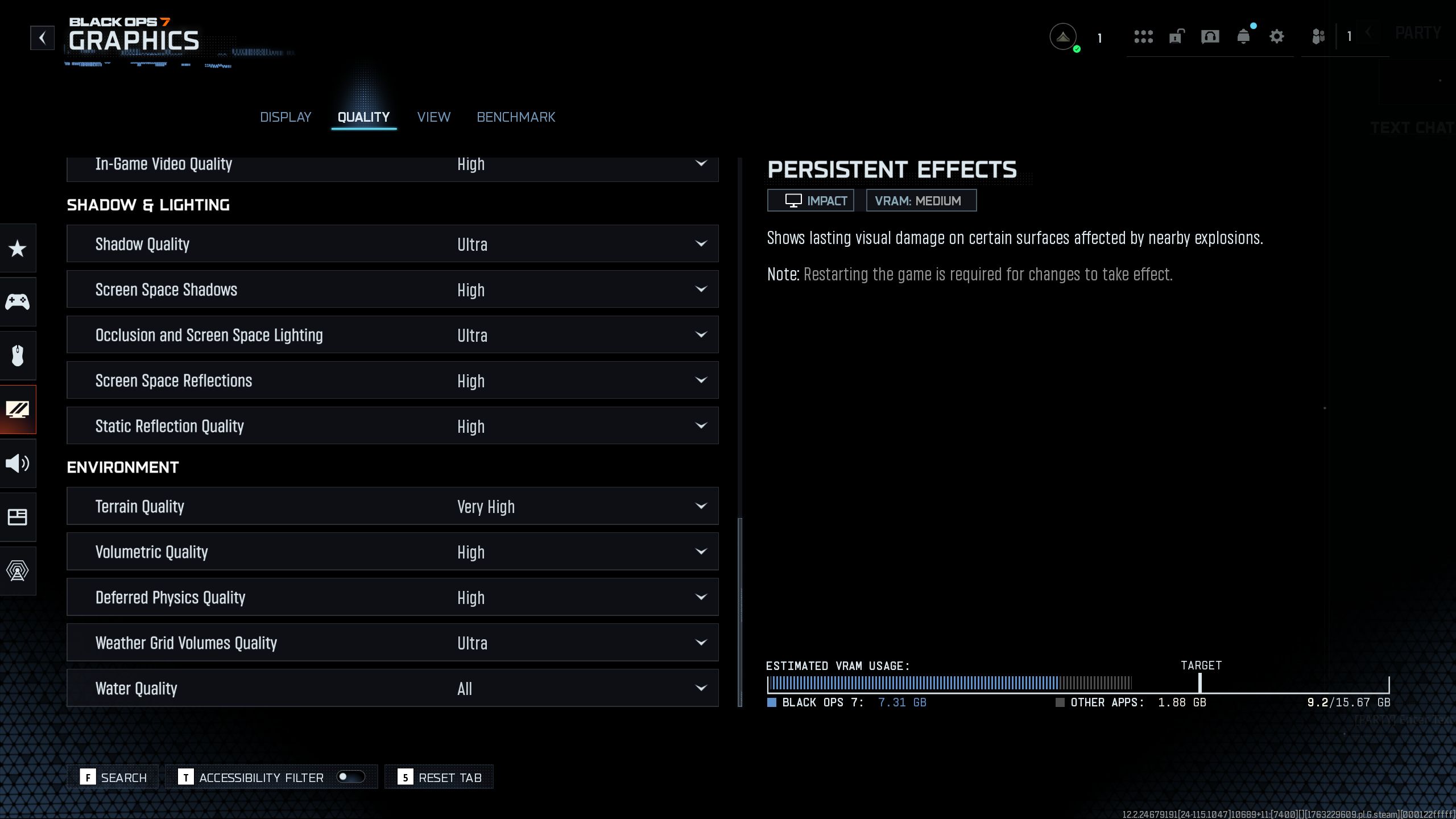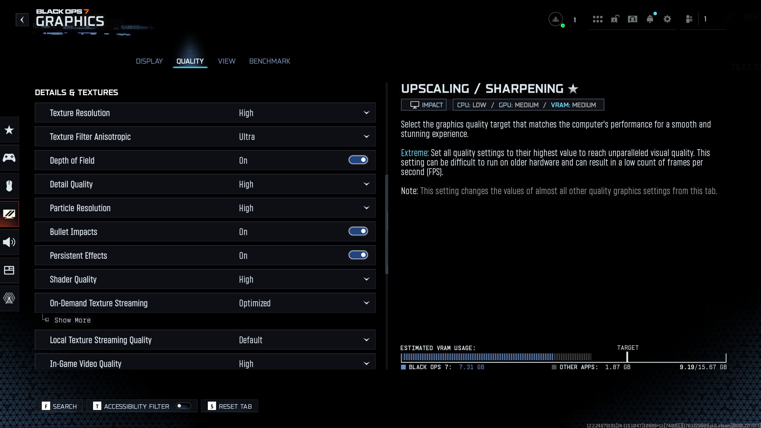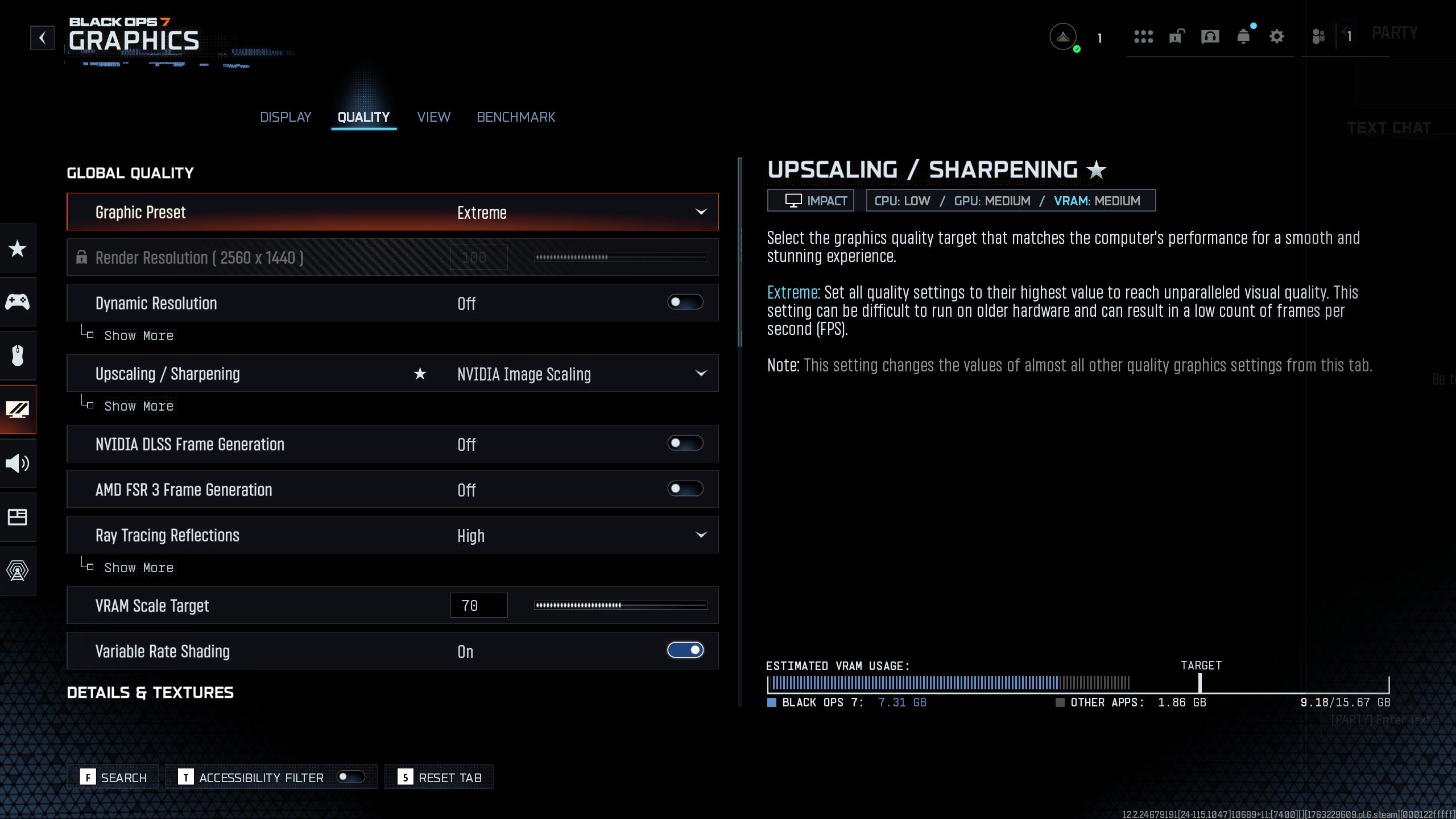 Podobnie jak większość obecnych gier, Call of Duty: Black Ops 7 jest dość wymagające pod względem pamięci VRAM, ale nie osiąga poziomu niektórych gier Unreal Engine 5 (zob Borderlands 4). Przykładowo, maksymalne ustawienia w rozdzielczości QHD wymagają około 8 GB pamięci VRAM. Najlepsze jest to, że zmiany ustawień są stosowane bezpośrednio, bez konieczności ponownego uruchamiania.