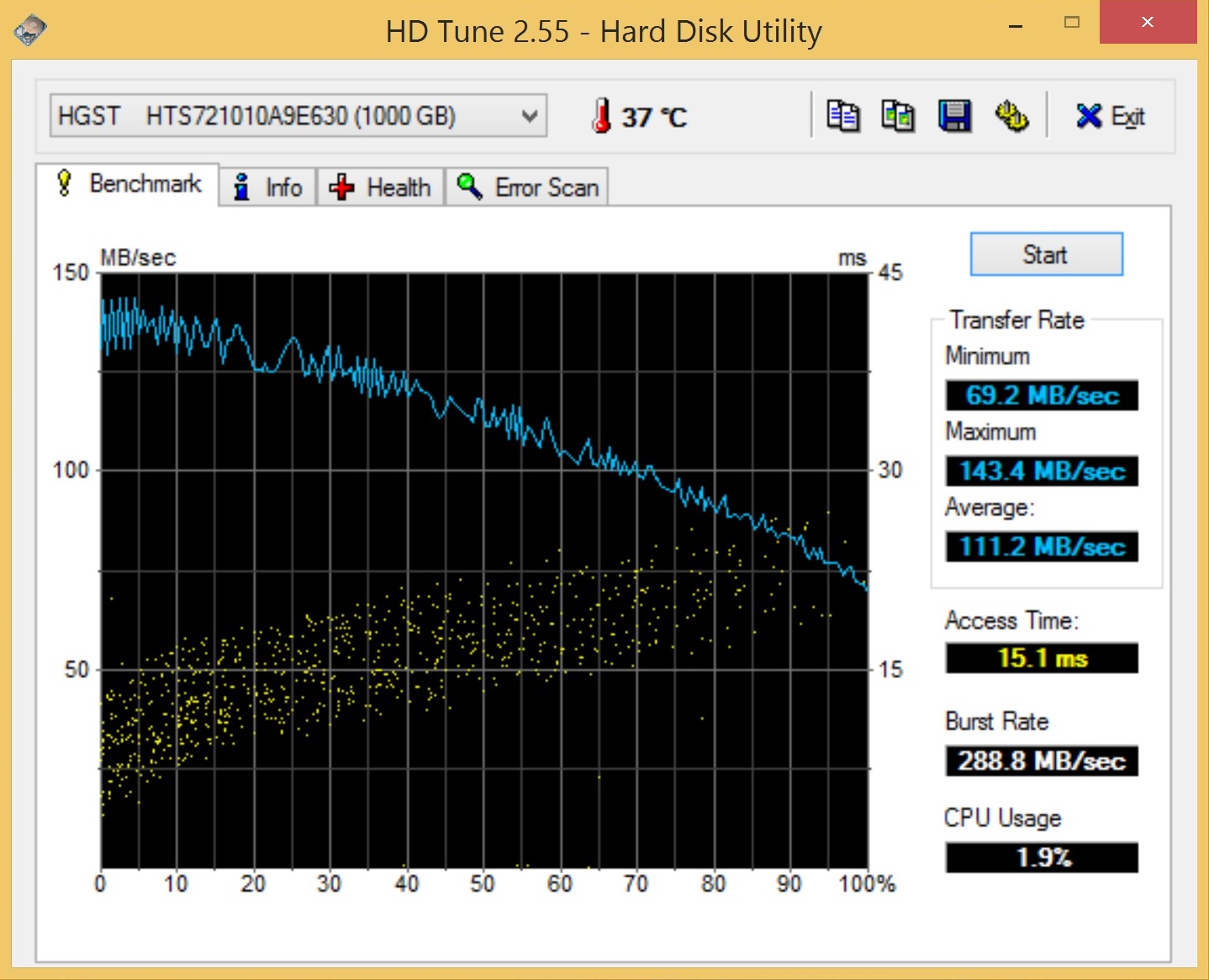 Dysk twardy to HGST Travelstar 7K1000 o pojemności 1000 GB i prędkości 7200 obr/min. W testach syntetycznych osiągnął on bardzo dobre wyniki. W testach aplikacji CrystalDiskMark odczyt sekwencyjny przekroczył 134 MB/s, a zapis wyniósł prawie 130 MB/s. To bardzo dobre wyniki, przynajmniej jak na dysk twardy.