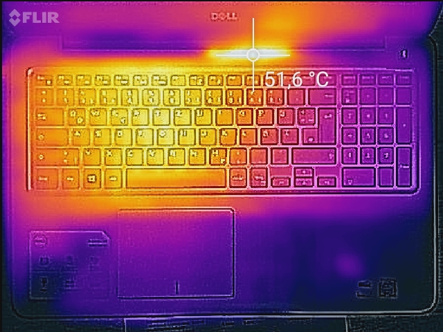 W godzinnym teście pełnego obciążenia temperatura procesora doszła do 93°C. Była więc niewiele niższa od wartości krytycznej (100°C). Częstotliwość taktowania CPU wynosiła około 2,9 GHz. Temperatura karty Radeon R7 M445 osiągnęła 79°C przy taktowaniu GPU w wysokości 920 MHz.