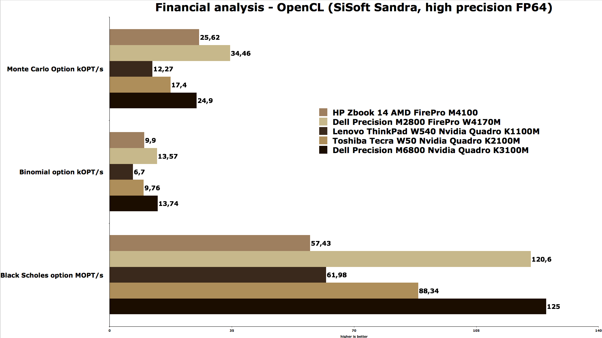 Jeżeli chodzi o testy OpenCL, karta FirePro W4170M wypadła w nich świetnie i dzięki temu w wielu przypadkach Precision M2800 zdobył czołowe miejsce w porównaniach. W testach Luxmark 2.0 (Sala Scene i Room Scene) dysponujący kartą FirePro W4170M Precision M2800 właściwie zdeklasował konkurencyjne notebooki z kartami Nvidia Quadro.