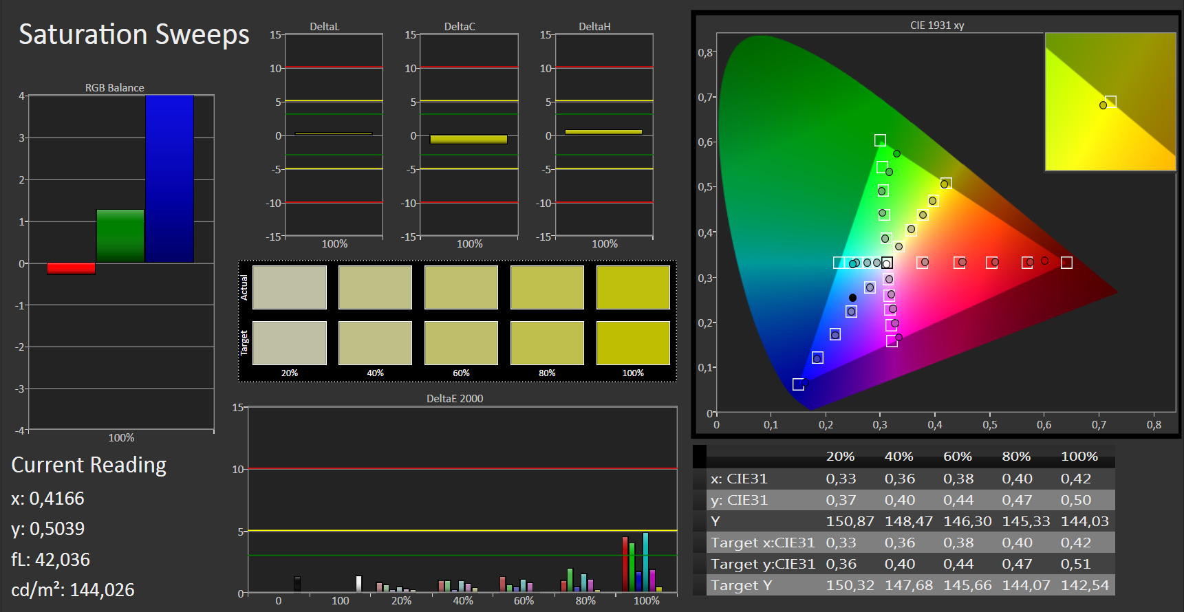 Pokrycie przestrzeni barw sRGB wyniosło około 65%. To zdecydowanie za mało do profesjonalnych zastosowań. Wierność kolorów w stanie fabrycznym również przedstawiała się bardzo słabo. Średni błąd DeltaE 2000 dla kolorów wyniósł aż 9,95. Przeprowadzenie kalibracji zupełnie zmieniło jednak postać rzeczy. Odchylenie DeltaE 2000 spadło do zaledwie 1,1. Kalibracja sprawiła też, że krzywa gamma uzyskała praktycznie idealny przebieg. Średni błąd DeltaE 2000 dla skali szarości spadł z 11,25 do tylko 1,1.