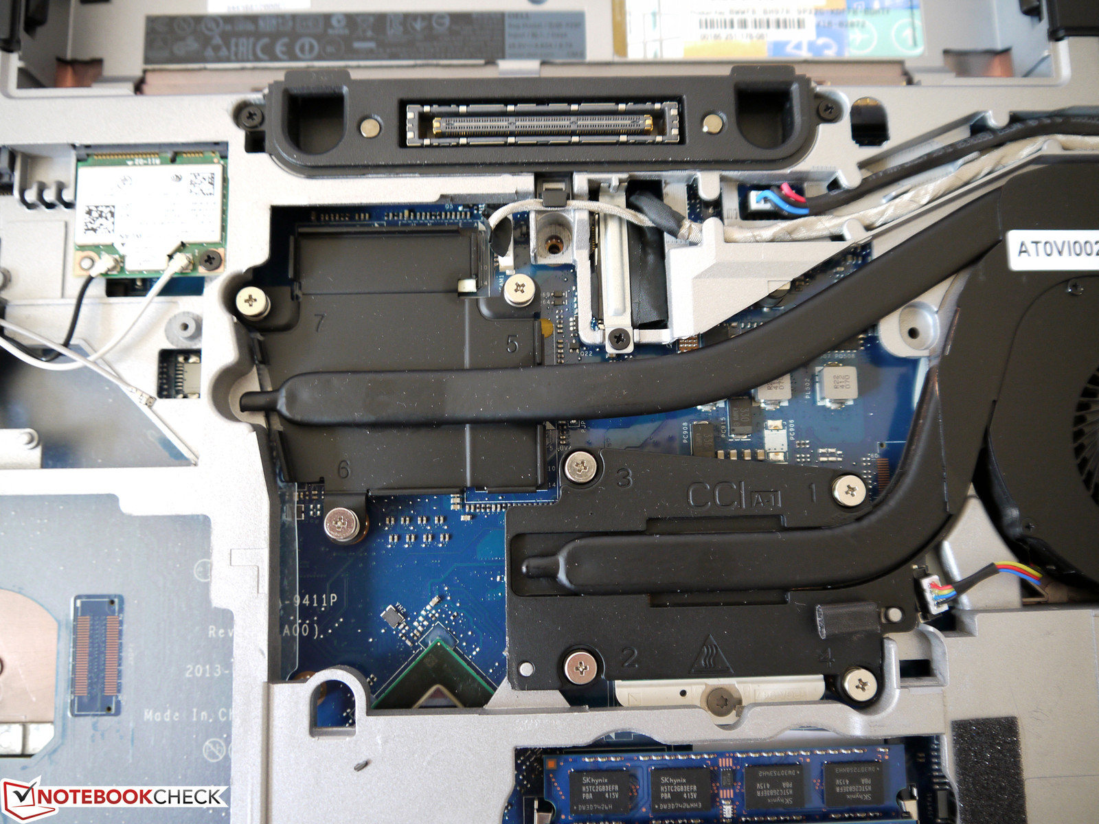 Spód jednostki zasadniczej da się zdjąć po odkręceniu niewielu śrubek. Po jego zdjęciu użytkownik ma dostęp do najważniejszych podzespołów wewnętrznych. Modyfikacje wyposażenia mogą dotyczyć pamięci RAM, modułu w gnieździe WWAN/mSATA, dysku SATA oraz napędu optycznego w kieszeni modułowej. W razie potrzeby można wyczyścić lub wymienić wentylator.