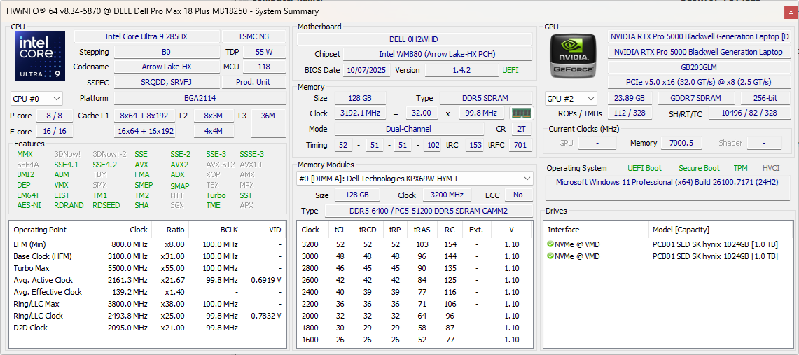 | Dell Pro Max 18 Plus MB18250 Ultra 9 285HX, RTX PRO 5000 Blackwell Generation Laptop, , IPS, 2560x1600, 18" | Schenker Key 18 Pro M25 RTX 5090 Ultra 9 275HX, GeForce RTX 5090 Laptop, Samsung 9100 Pro 4 TB, IPS, 3840x2400, 18" | HP ZBook X G1i 16 Ultra 7 265H, RTX PRO 2000 Blackwell Generation Laptop, Samsung PM9A1 MZVL22T0HBLB, IPS, 2560x1600, 16" | HP ZBook Studio 16 G11 Ultra 9 185H, RTX 3000 Ada Generation Laptop, Kioxia XG8 KXG80ZNV1T02, IPS, 3840x2400, 16" | Lenovo ThinkPad P16 Gen 2 i7-14700HX, RTX 4000 Ada Generation Laptop, SK hynix PC801 HFS001TEJ9X162N, IPS, 2560x1600, 16" | Dell Pro Max 16 Plus Ultra 9 285HX, RTX PRO 5000 Blackwell Generation Laptop, SK hynix PCB01 HFS001TFM9X186N, OLED, 3840x2400, 16" | |